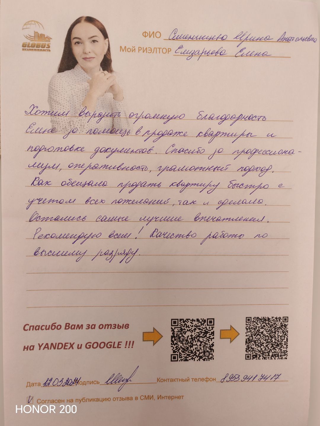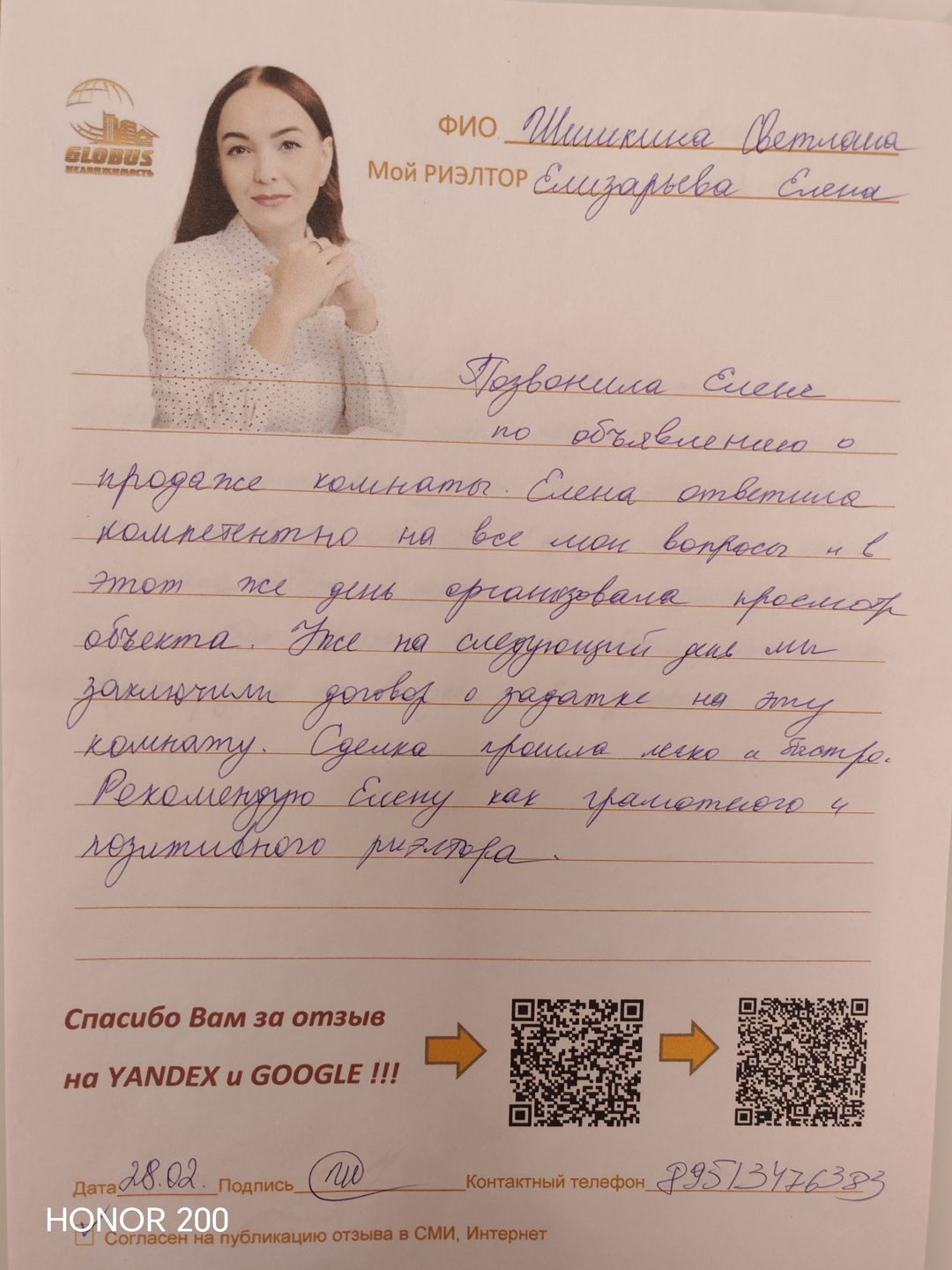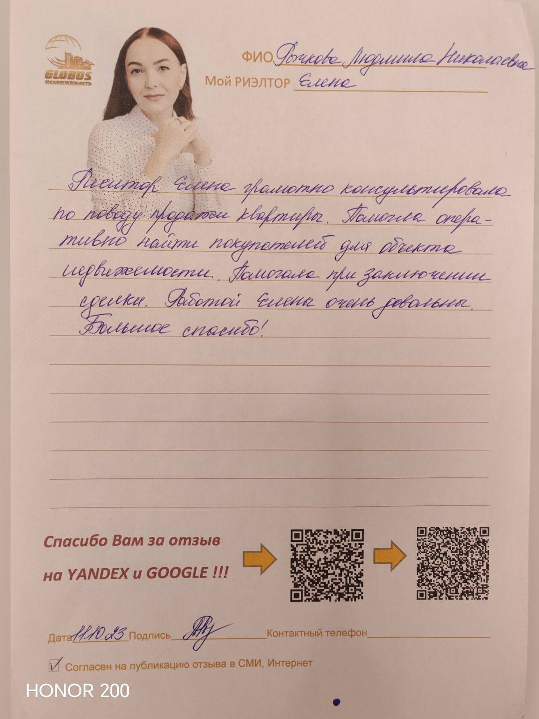 Огромная благодарность Елене !Отличный специалист. Елена всегда была на связи. Все четко и по делу . Добросовестный, грамотный риэлтор. Спасибо за помощь. Будем рекомендовать!