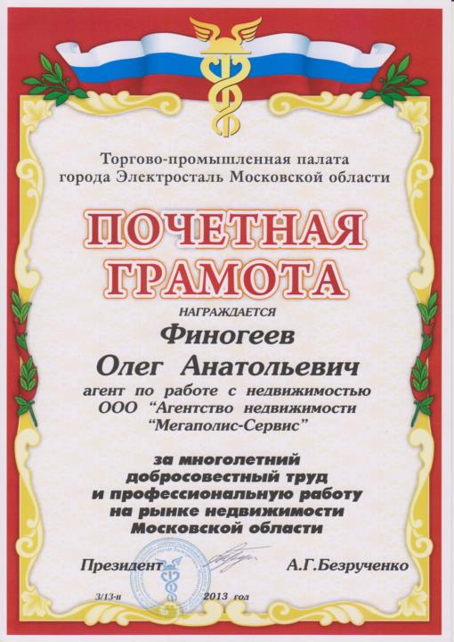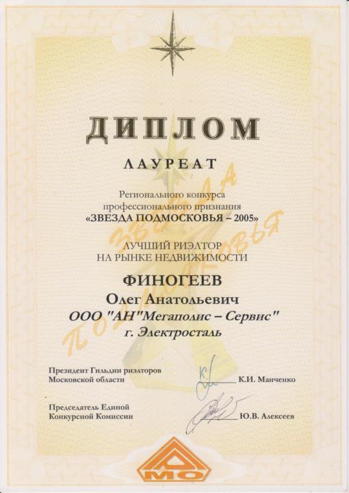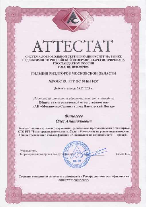 Аттестат реестра РГР № РОСС RU РГР ОС 50 АН 151 Стаж работы с 1997 года Специализация Покупка, продажа, обмен вторичного жилья Награды(признания) 1. Благодарственное письмо за большой вклад в развитие цивилизованного рынка недвижимости. 2. Диплом - Лауреат Регионального конкурса "Звезда Подмосковья - 2005" лучший риэлтор на рынке недвижимости. 3. Почетная грамота от торгово-промышленной палаты...