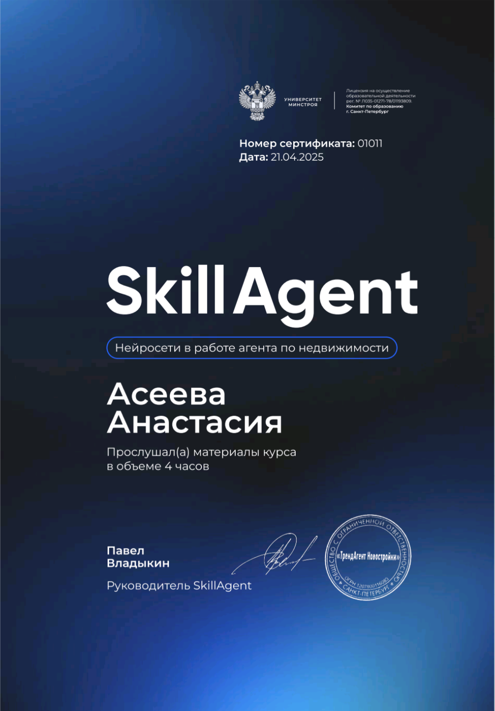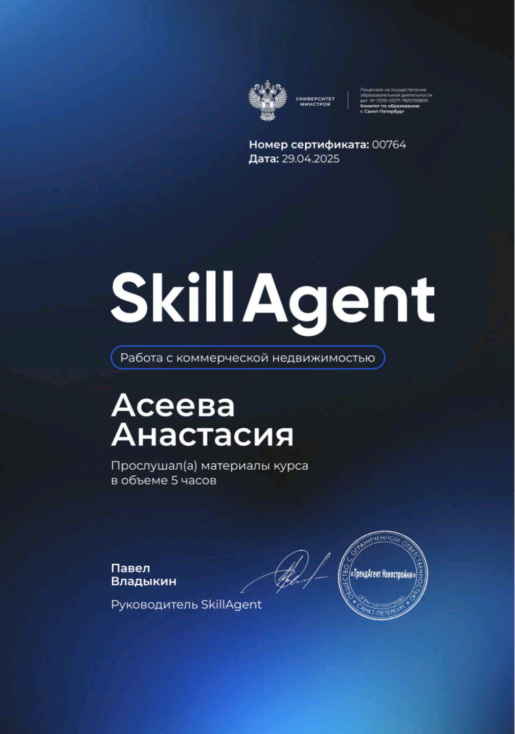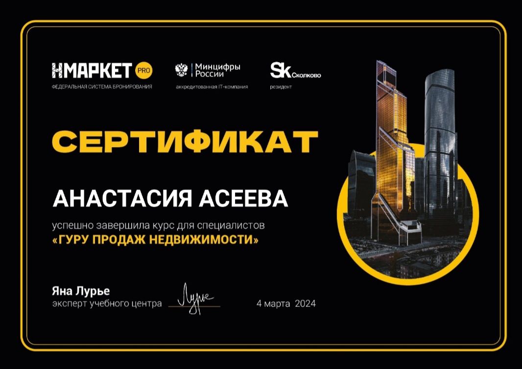 Опыт работы в сфере недвижимости: с 2009 г. Покупка/продажа квартир (вторичное жилье, новостройки) Покупка/продажа/аренда коммерческой недвижимости (офисные, торговые, складские и производственные помещения) Юридическое сопровождение сделок с недвижимостью Помощь в оформлении/одобрении ипотеки