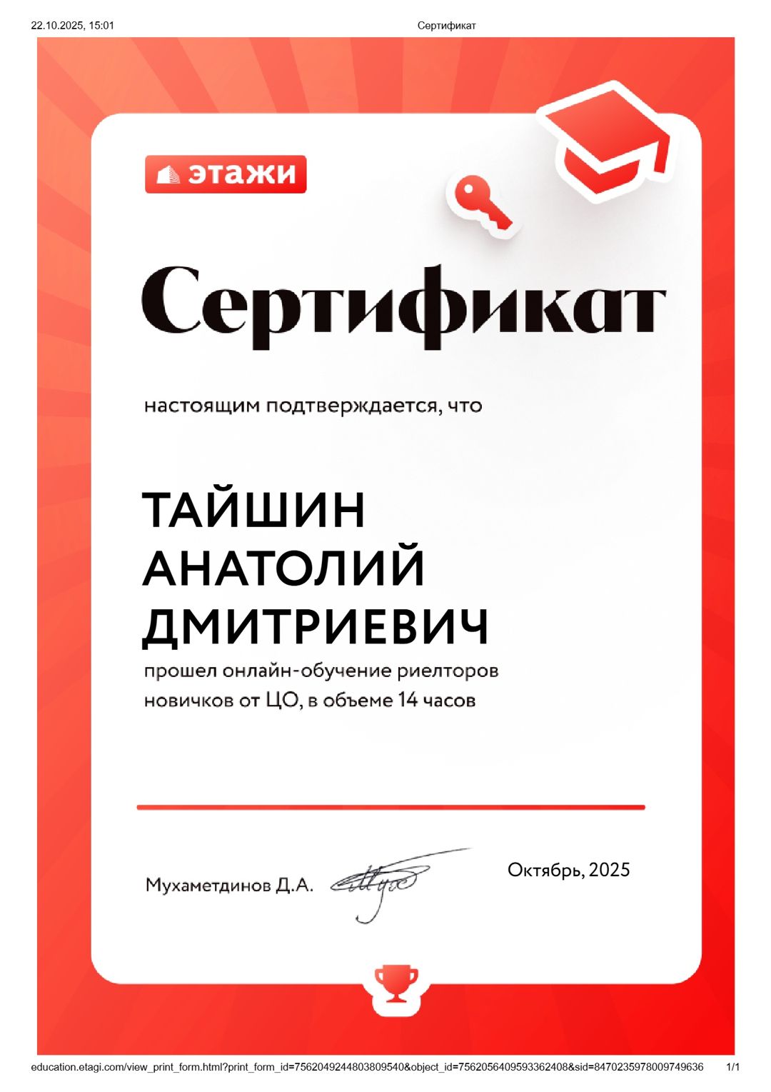 Хоч выразить благодарность риелтору Тайшину Анатолию Дмитриевичу ,за быструю и качественную помощь в выборе квартиры, оформлении ипотеки. Сделка была проведена Заблаговременно готовили всё необходимые для сделки документы, вели полное сопровождение сделки от самого начала до самого окончания.Спасибо вам огромное! Рекомендую!!
