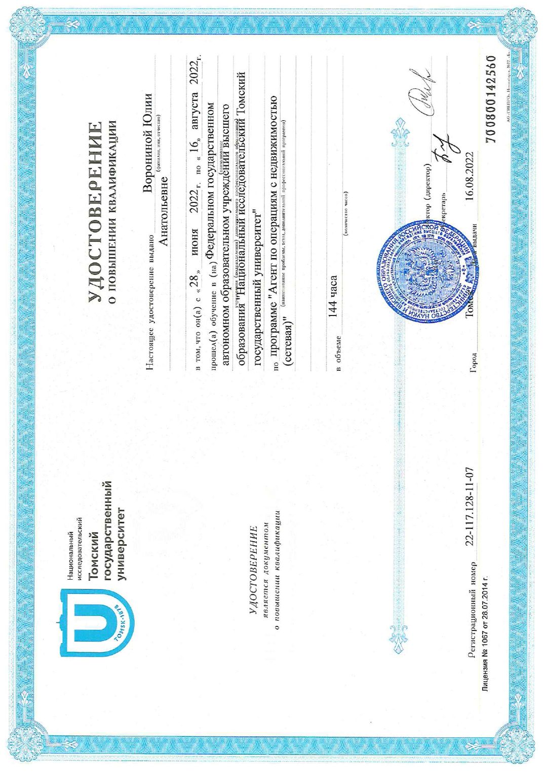 Имею высшее юридическое образование, удостоверение о повышении квалификации по программе "Агент по операциям с недвижимостью". За период работы в сфере недвижимости мною лично проведено более сотни ипотечных сделок и тысячи других различной сложности.