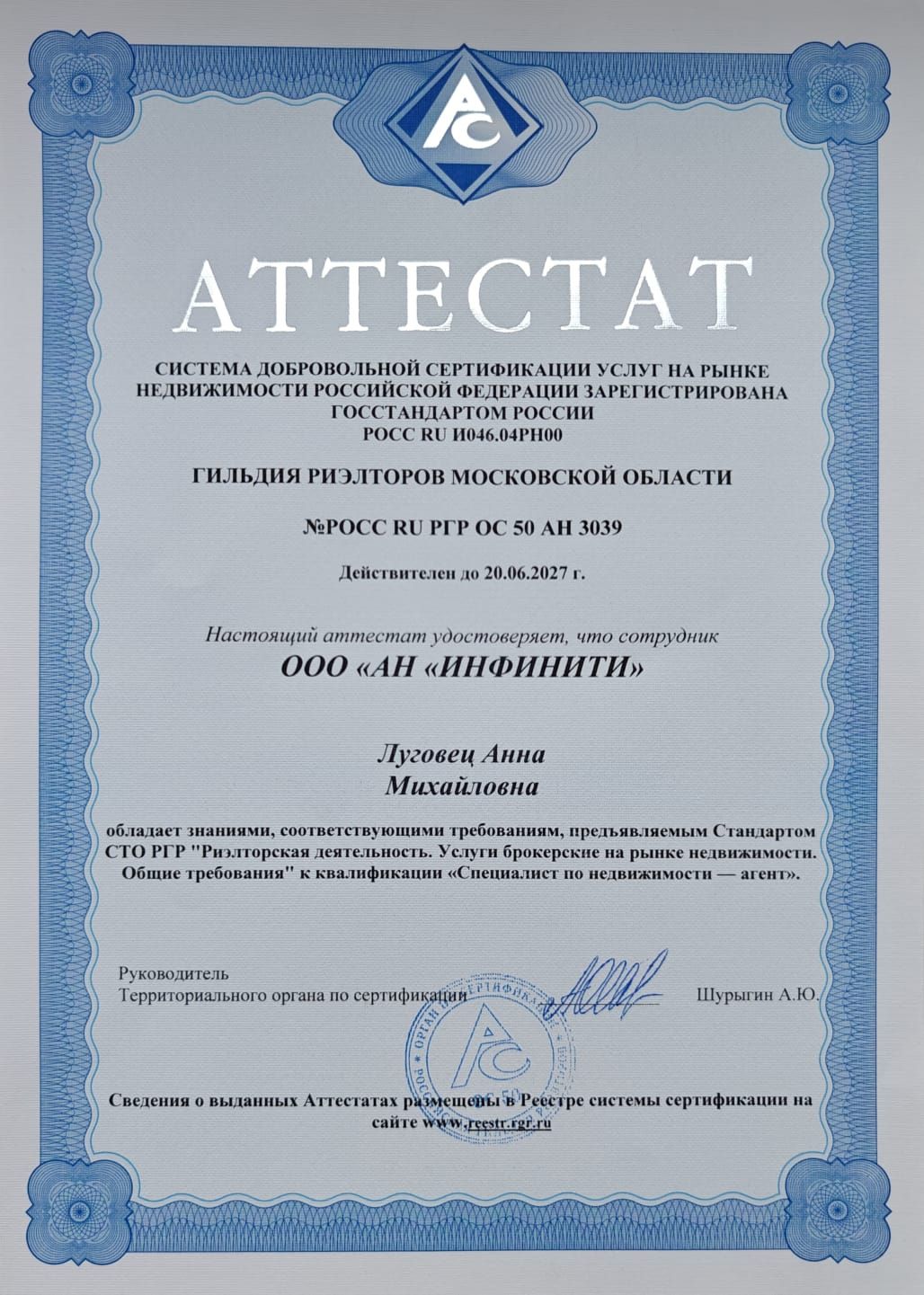 Обратились в агентство « Инфинити» с целью продажи и дальнейшей покупки квартиры большей площади. Риэлтор Анна Луговец очень внимательно и ответственно отнеслась к нам. Сделка была очень сложной, Анна проявила себя как настоящий профессионал своего дела. Очень благодарны Анне за ее работу, будем советовать своим знакомым.