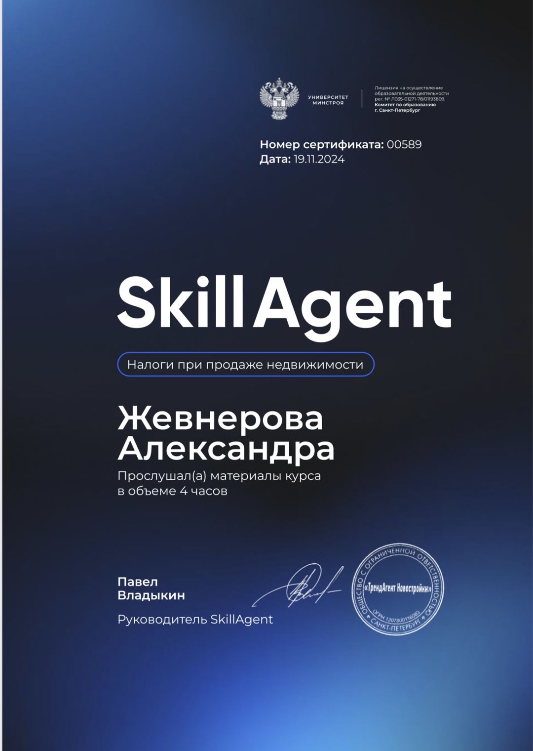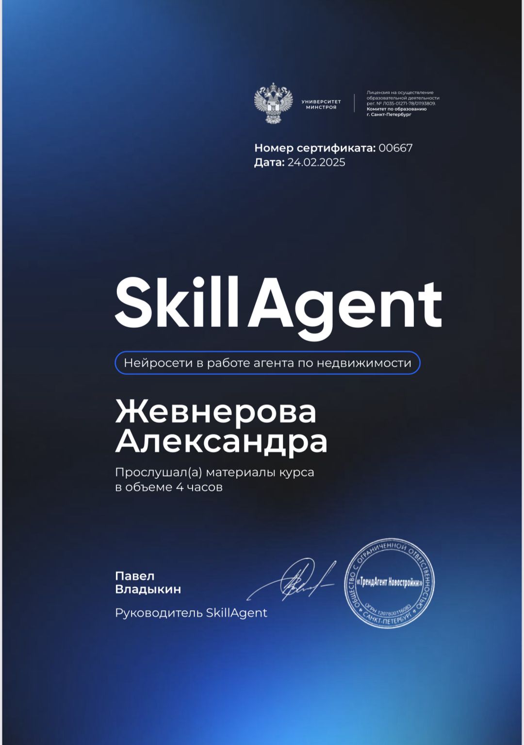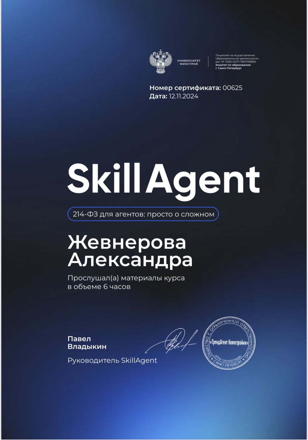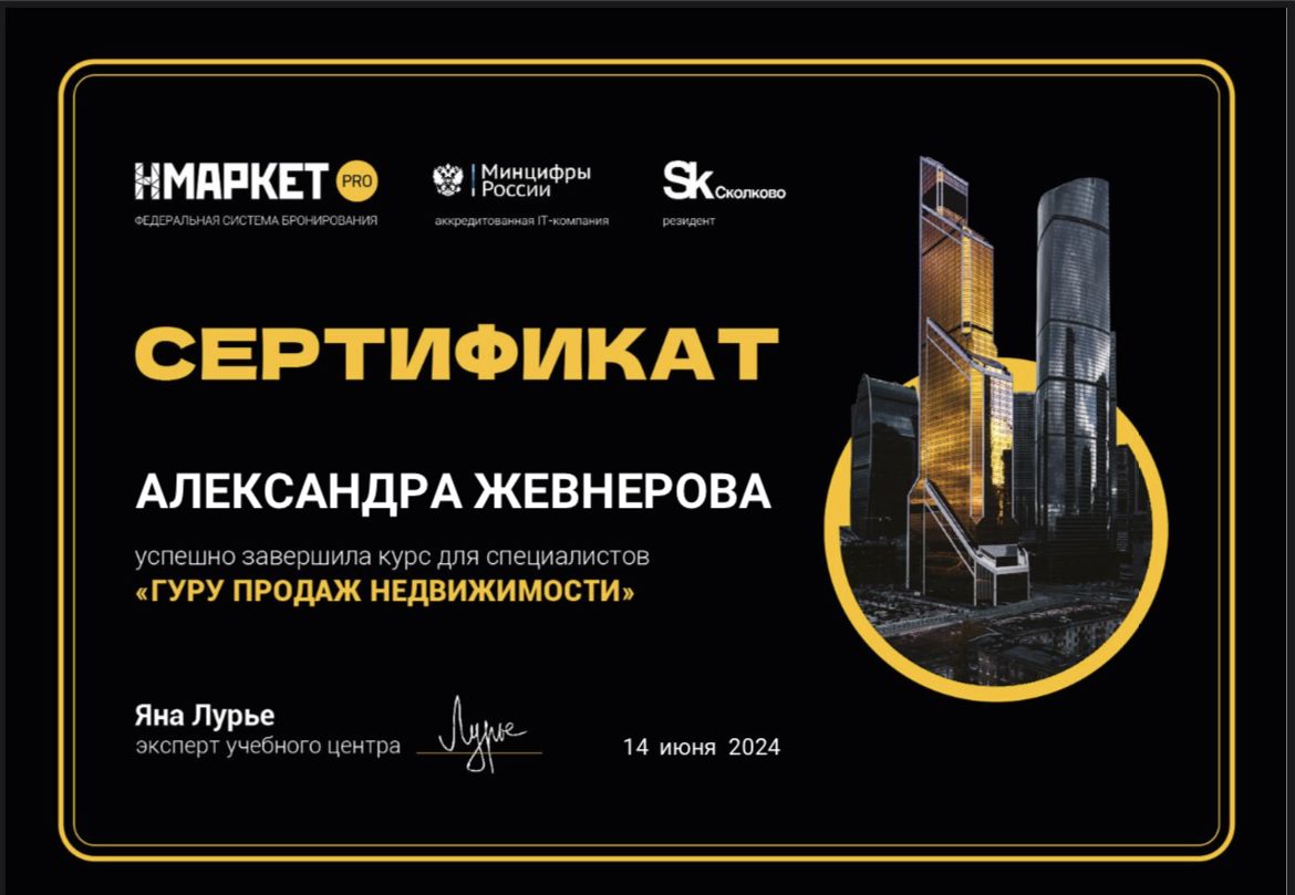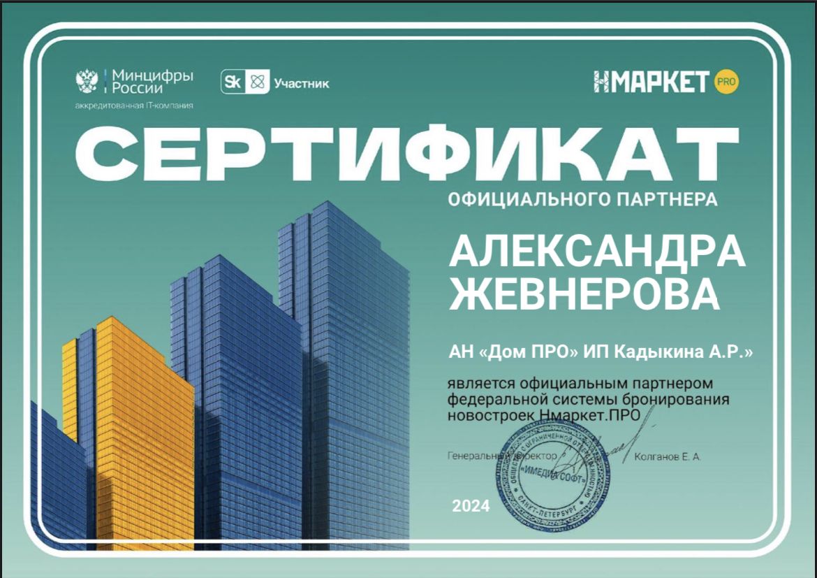 Хочу поделиться своим положительным опытом работы с Александрой Жевнеровой, которая помогла мне купить квартиру мечты! Благодаря ей, весь процесс был простым и очень комфортным,за что я очень благодарна! Кроме того,она всегда была на связи, отвечая на все вопросы и развеивая все мои переживания. Я очень удовлетворена результатом и могу рекомендовать услуги Александры всем, кто планирует...