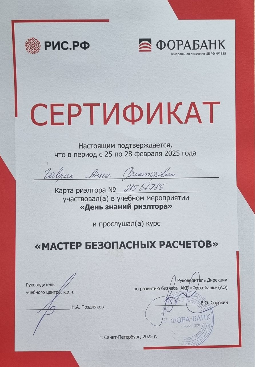 Хочу выразить благодарность Анне за проделанную работу! Помогла найти идеальный для нас вариант квартиры, вовремя забронировали ее и успели до повышения цены. На протяжении всей сделки Аня была на связи и проговаривала нам дальнейшие шаги 👌Смело обращайтесь к ней за покупкой своей квартиры мечты 🙂Однозначно рекомендую как хорошего специалиста и порядочного человека 👍