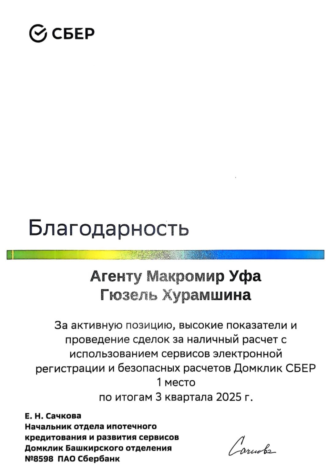 Выражаю большую благодарность Гузель Хурамшиной за проделанную работу! Очень грамотный, высоко квалифицированный специалист. Всё сделала качественно, безопасно, в срок. Я довольна приобретением! Спасибо вам большое, удачи во всём!