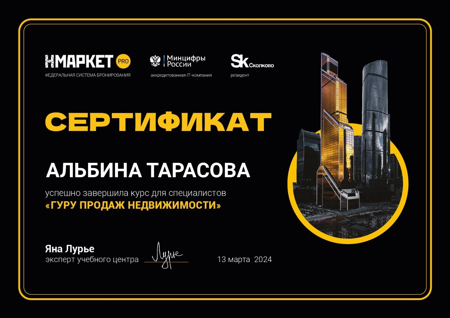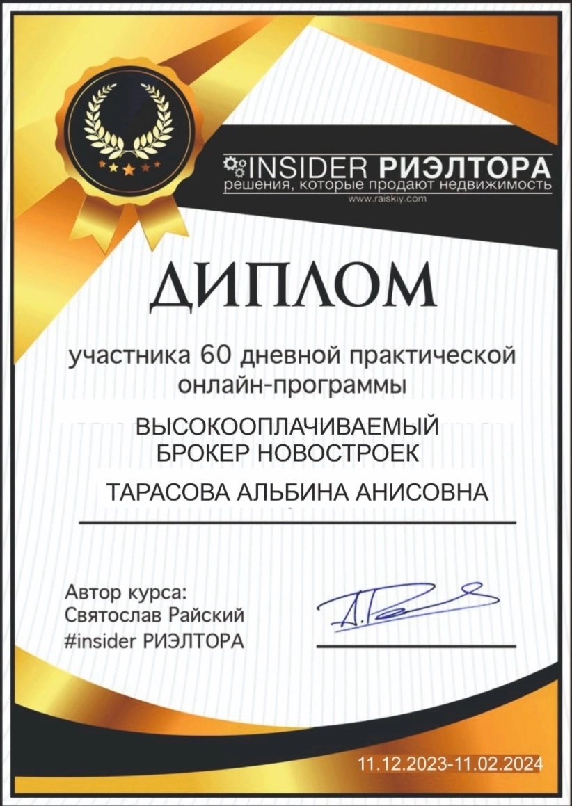 Здравствуйте! Вчера оформили квартиру моей мечты в ипотеку !!! Альбина нашла мне застройщика , место , учла все мои пожелания, были моменты с банками , и этот вопрос тоже был решен, чувствовалась забота и поддержка на всех этапах !!! Сопровождение от начала и до конца!!! Даже вручили призент фирменный за успешную сделку!!! Всегда на связи , на все вопросы получите ответы! Рекомендую от души !...