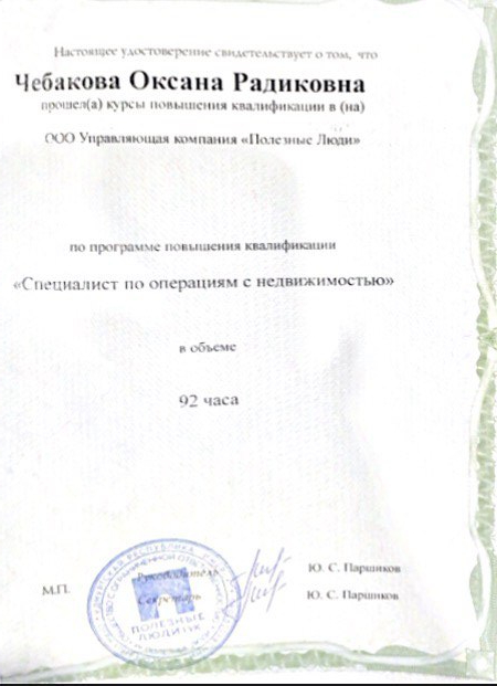 Покупали квартиру в Ангарске. Обратились в Агенство недвижимости Полезные люди по рекомендации знакомых к риэлтору Чебаковой Оксане Радиковне. С момента заключения договора Оксана Радиковна была всегда на связи, подбирала варианты, консультировала по любым вопросам , подготовила весь пакет документов, была с нами на всех этапах проведения сделки. Досконально проверила юридическую чистоту...