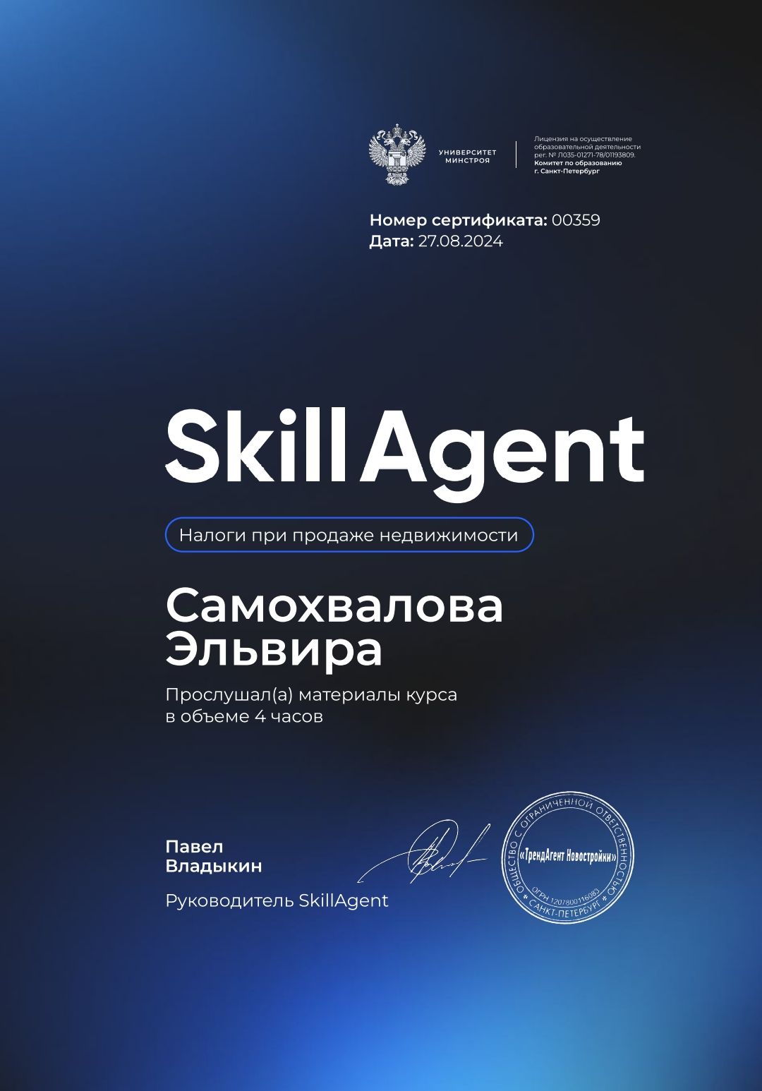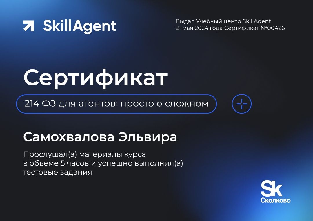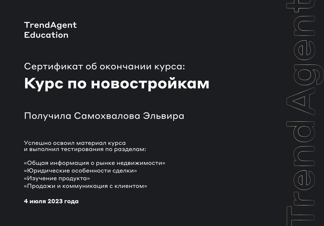 - СДСергей Д.7 ноября 2024, сделка была 29 октября 2024Очень профессиональный специалист. Огромное спасибо. Всё было зделано быстро и качественно. И просто очень хороший человек, очень приятное общение. Рекомендую всем не пожалеете. Мастер своего дела.  Эльвира СамохваловаРиелтор ответил 8 ноября 2024 Эльвира СамохваловаРиелтор ответил 8 ноября 2024Сергей, благодарю за отзыв! Рада, что всё сложилось благополучно. Счастья вашей семье в новом доме!