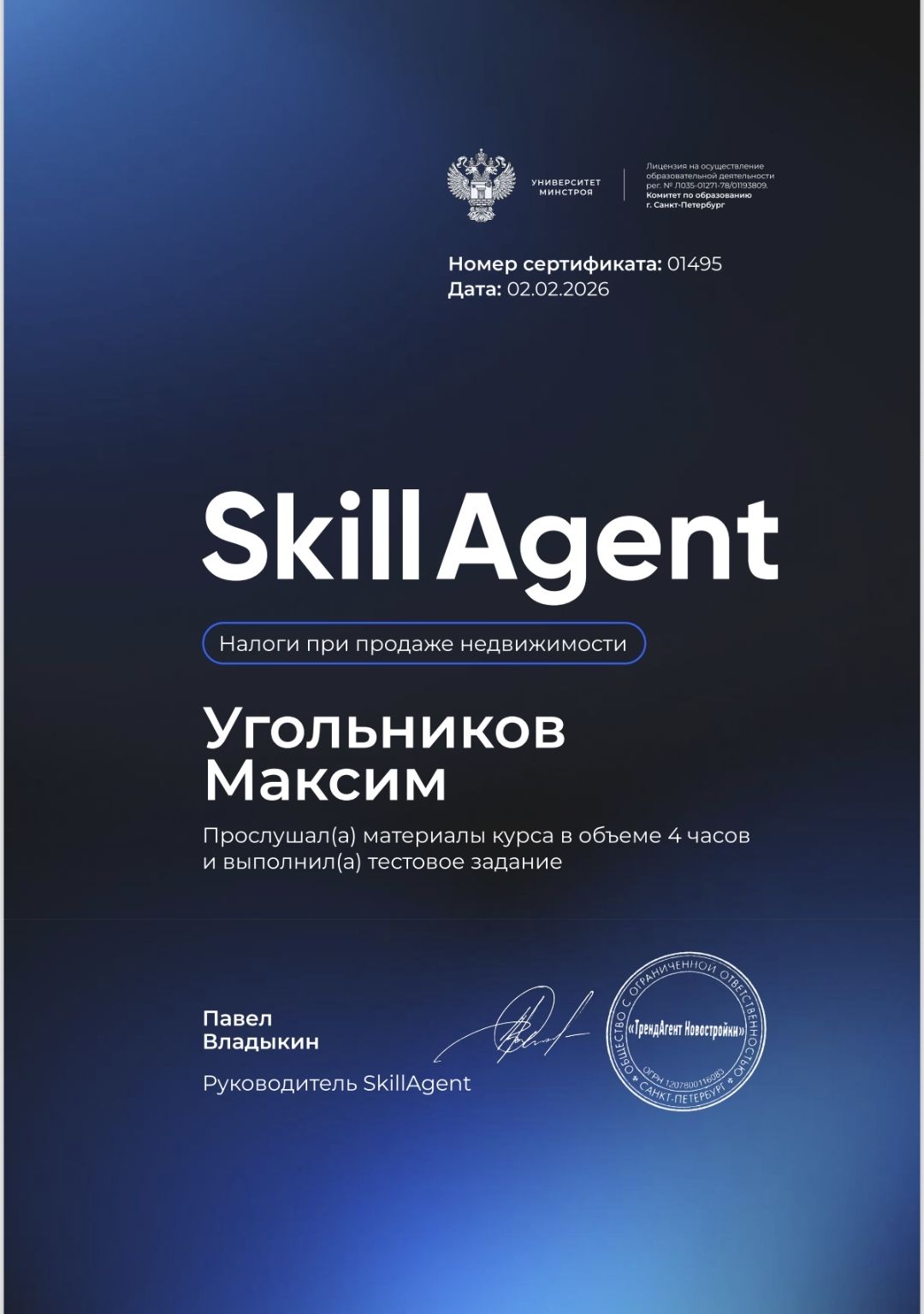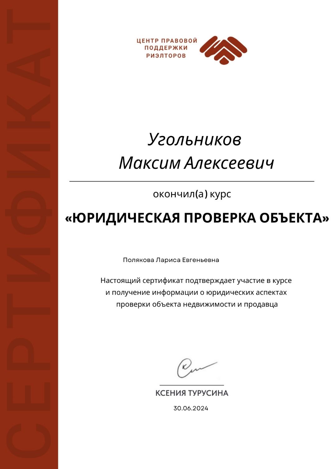Настоящий профи! Понравилось, что Максим всегда был на связи и держал меня в курсе всех деталей. Никаких белых пятен, каждый этап был понятен и предсказуем. Как итог сделка завершилась успешно. Большое спасибо за спокойную и уверенную работу. Вы сняли с меня огромный груз ответственности!