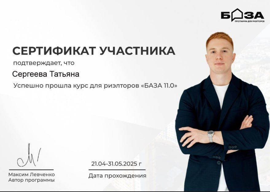 Добрый день! меня зовут Татьяна. уже более 3х лет я занимаюсь продажей/покупкой/арендой недвижимости. Я могу быть вам полезна 👇 ⭐Если вы планируете приобретать недвижимость: (от 50.000 руб) * при подборе недвижимости по вашим критериям, учитывая все нюансы; *при проверке объектов недвижимости и их владельцев; * на просмотрах и переговорах; * при оформлении аванса и подготовке документов к...