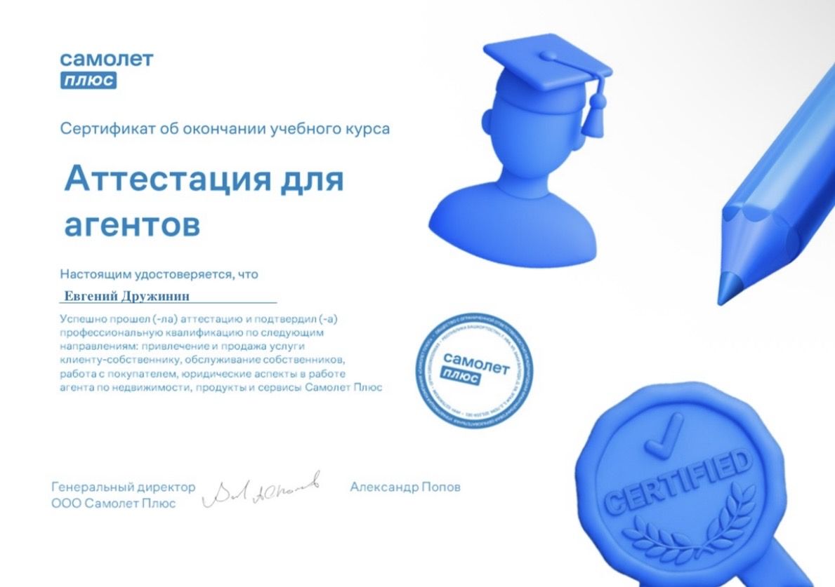 Большая благодарность Евгению Дружинину за подготовку и ведение сделки по нашему, уже не первому, объекту недвижимости. Моя рекомендация на 100%