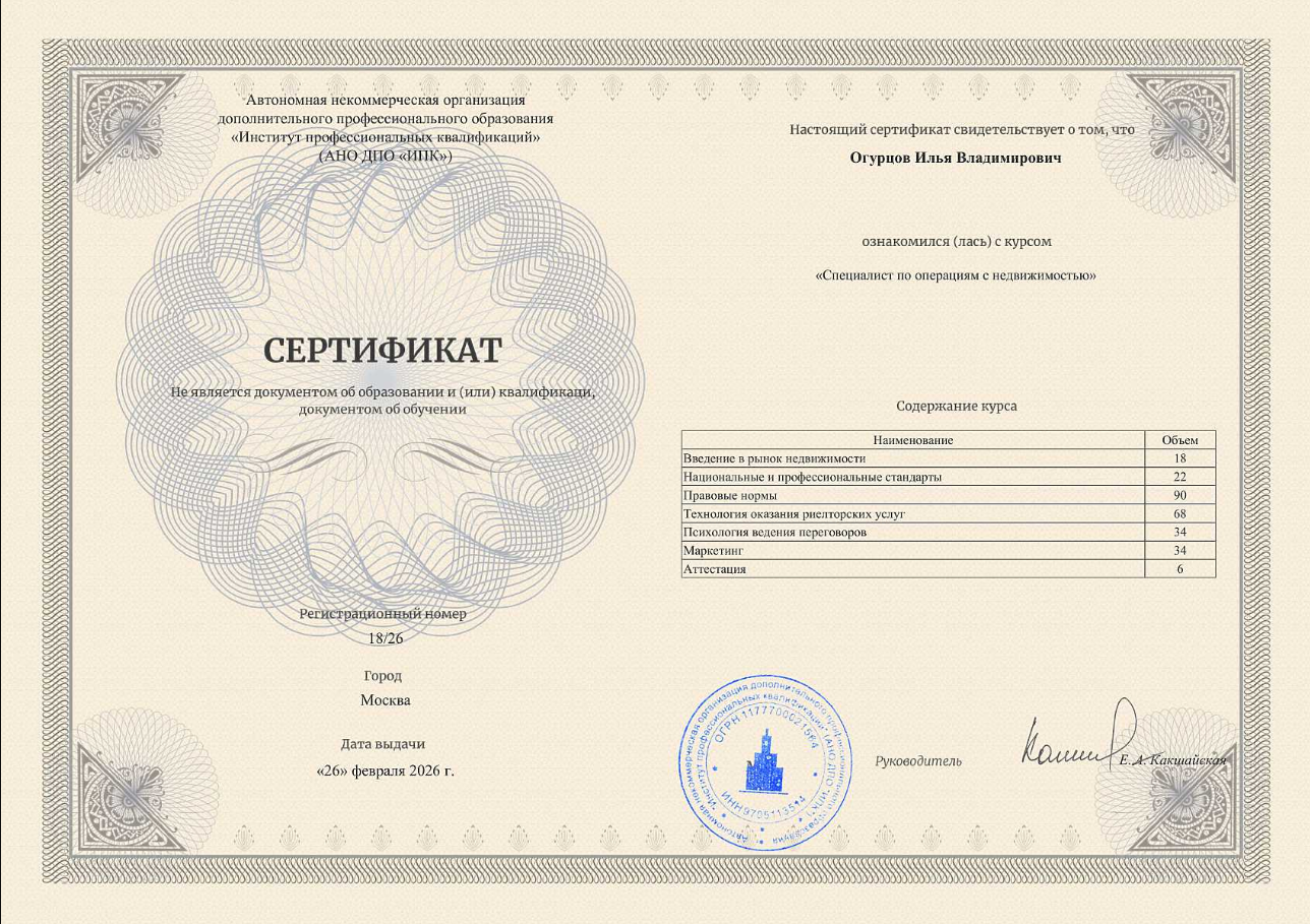 Большое Спасибо Илье, очень грамотный специалист. Оформили сделку легко и быстро. Если во время оформления возникали вопросы, всегда был на связи! Профи своего дела, и хороший человек. Рекомендую 👍. Всех друзей и знакомых буду направлять только к Илье.