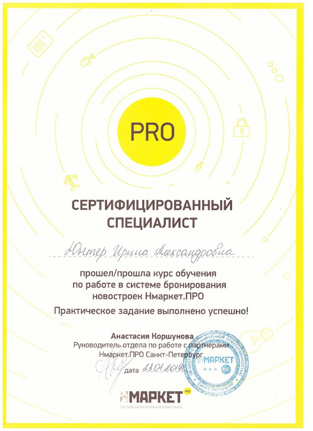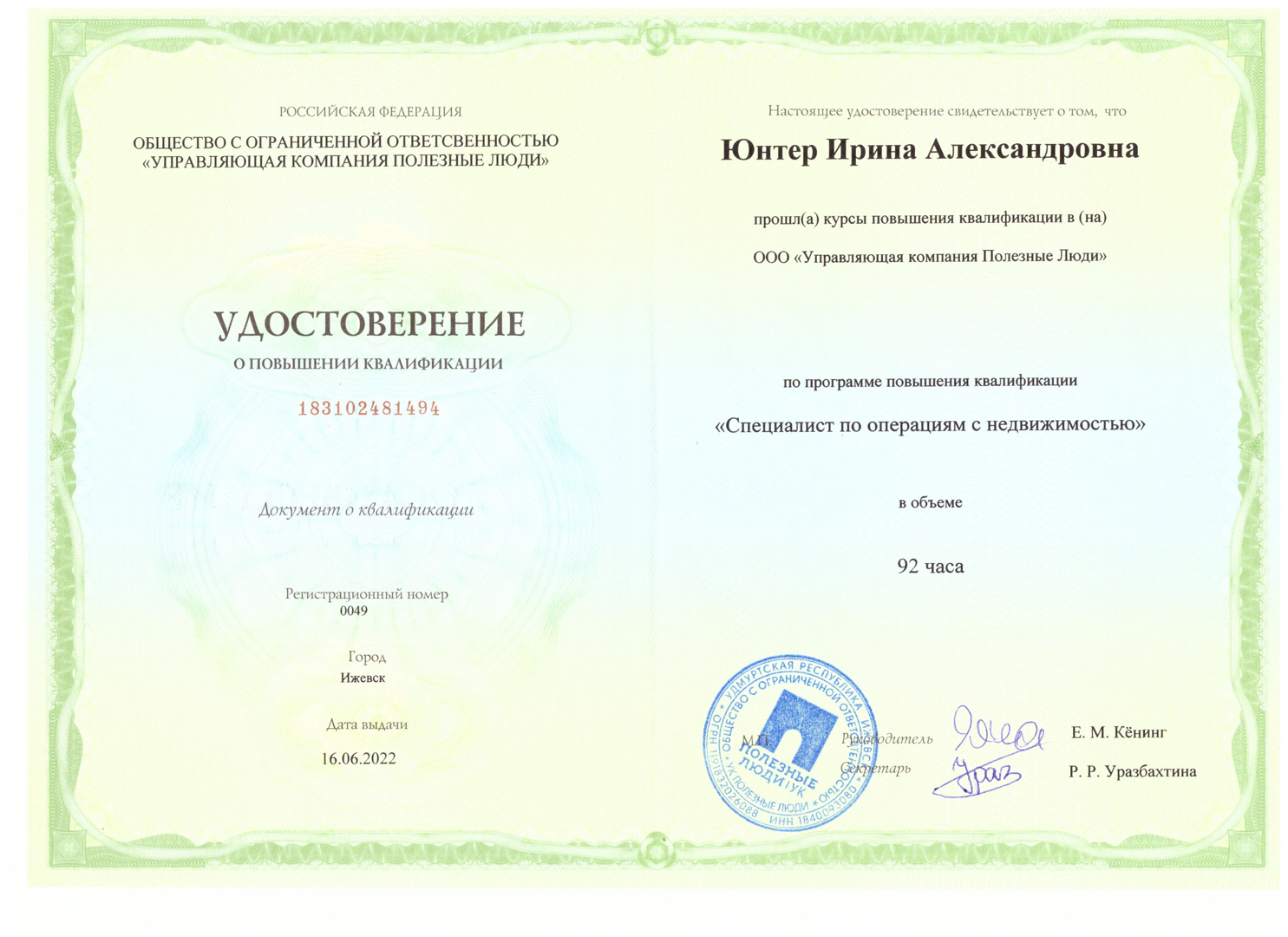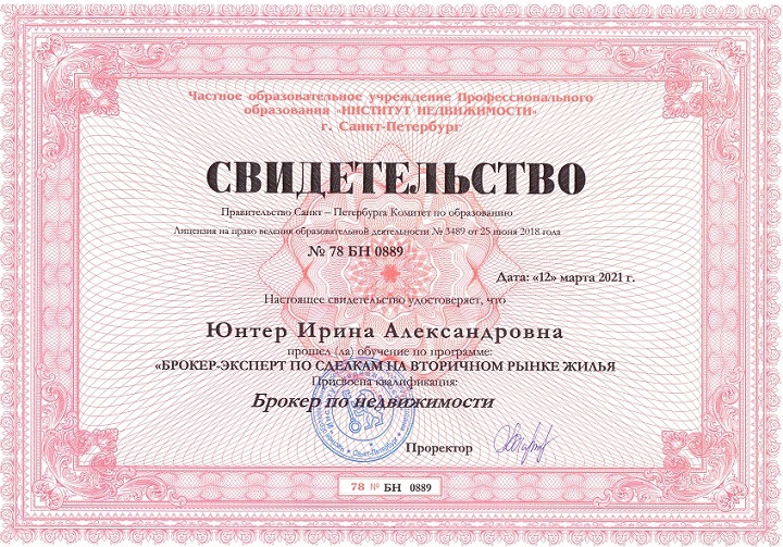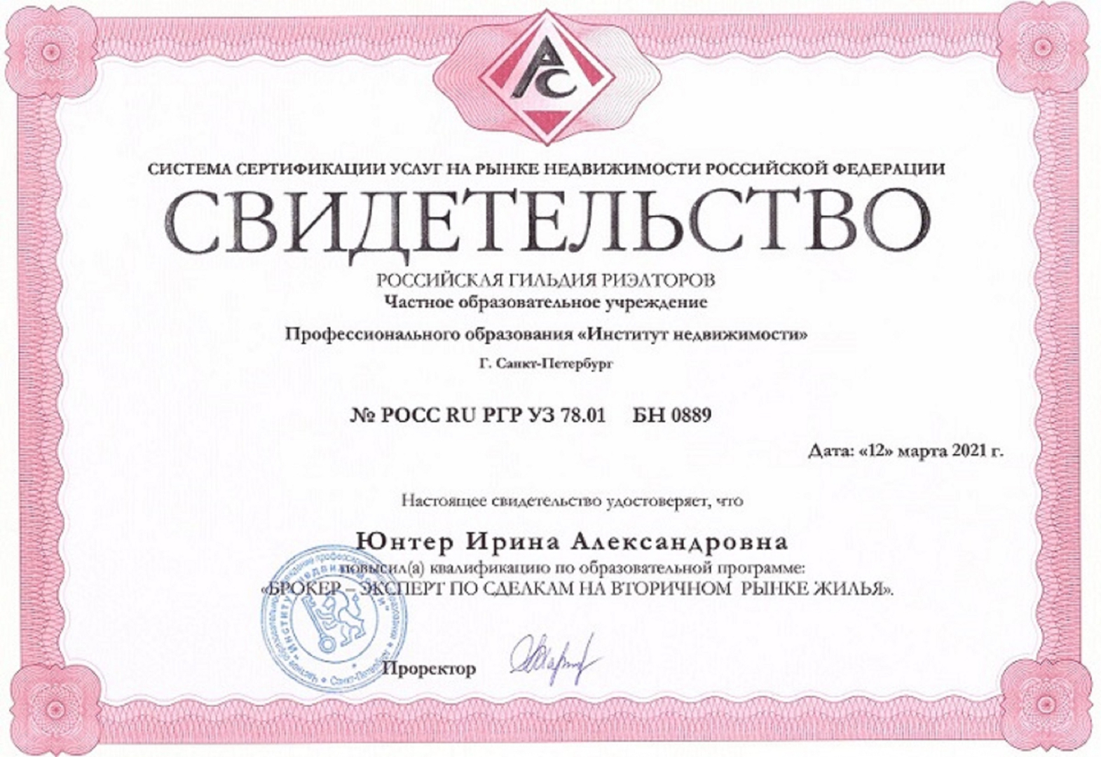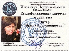 Нашим риэлтеров при покупке квартиры была Ирина Юнтер от этой сделки остались только положительные впечатления .Всё было сделано в очень короткий срок. Ирина специалист высокого класса,учитывает все нюансы ,пожелания.Грамотно составлен маршрут сделки я приехала из другого города всего на один день и благодаря Ирине мы всё успели сделать.Смело могу рекомендовать при приобретении недвижимости...
