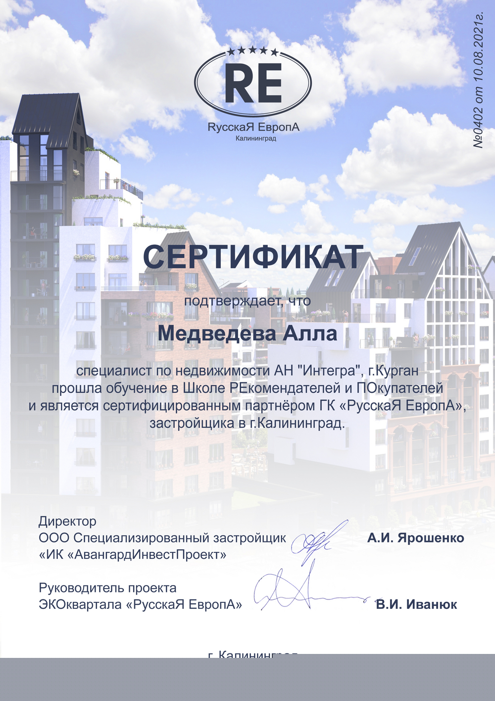 Здравствуйте! Меня зовут Алла Медведева, профессиональный риелтор с 2009 года. За это время я обеспечила счастье более 3000 клиентов благодаря внимательному отношению и индивидуальному подходу к каждому. Работаю по всей России, решая вопросы как на вторичном рынке так и на рынке новостроек. Кроме того, я гордо представляю два значимых проекта нашей страны: являюсь Амбассадором Русской Европы г....