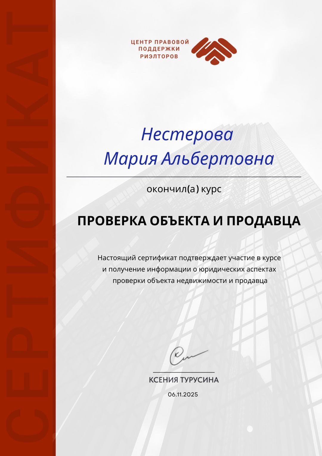 Огромная благодарность Марие Альбертовне, за помощь в продаже квартиры. Помогла продать квартиру а другом городе, контролировала весь ход сделки, все объясняла доходчиво и понятно. С уверенностью могу рекомендовать как грамотного специалиста.