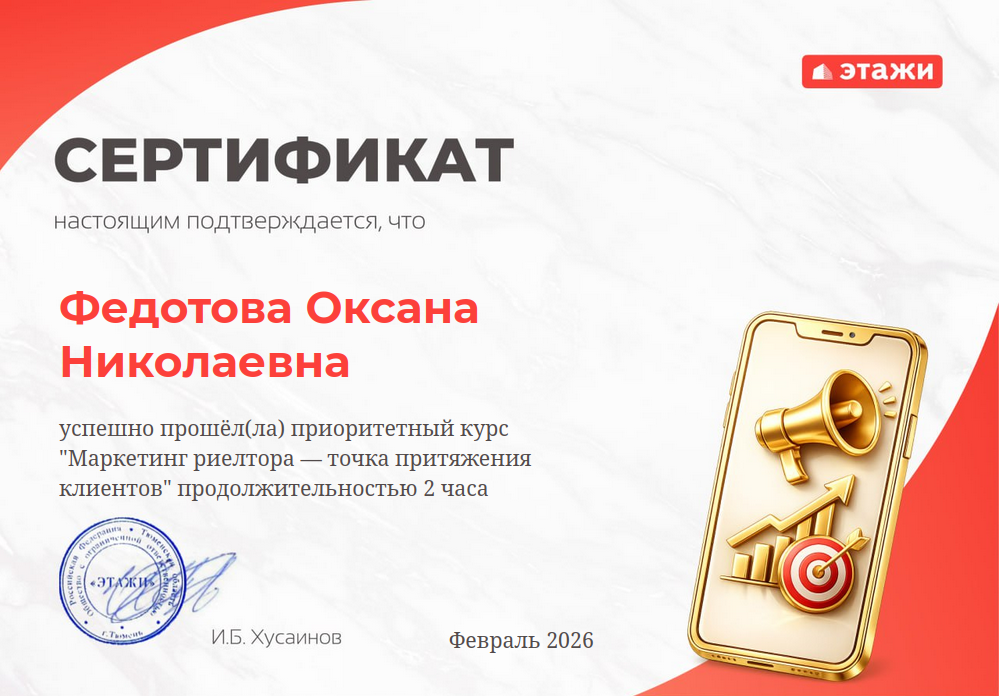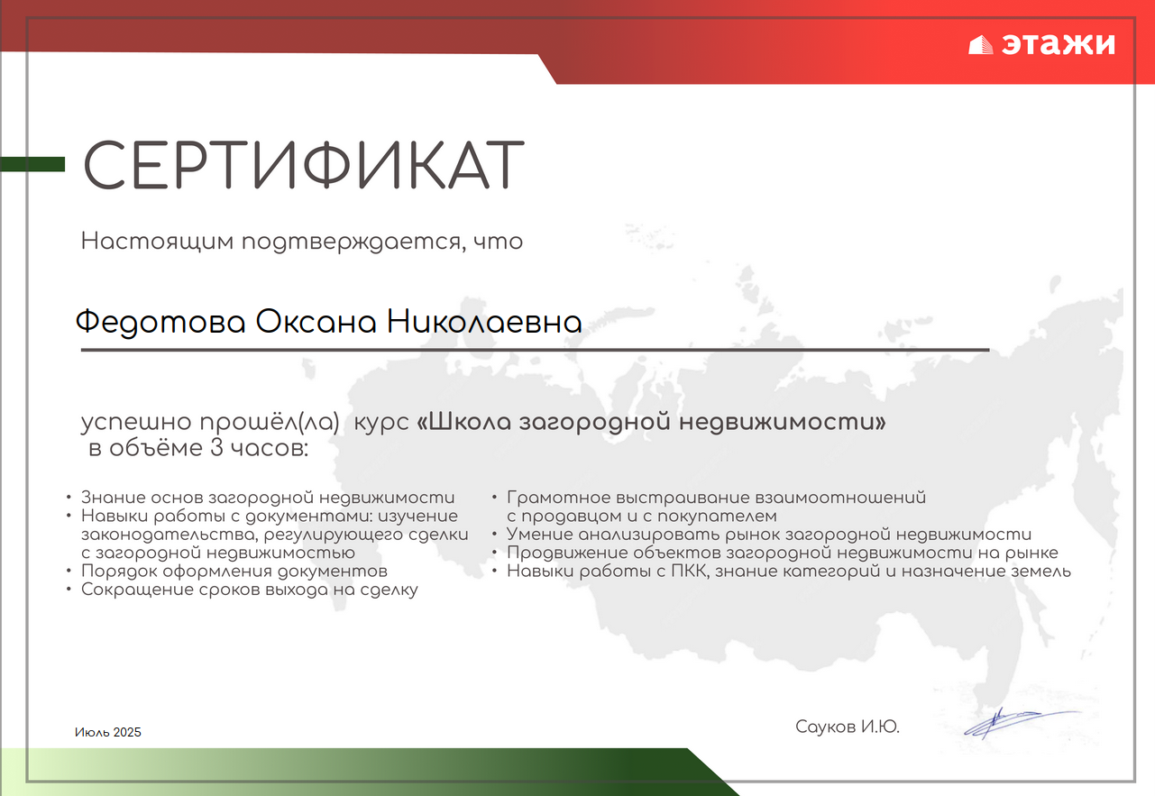 Выражаю искреннюю благодарность Оксане Федотовой за профессионализм и сопровождение сделки на всех этапах, от поиска дома до получения документов. Всё прошло четко, прозрачно и быстро. Спасибо за честную работу и позитивный настрой!