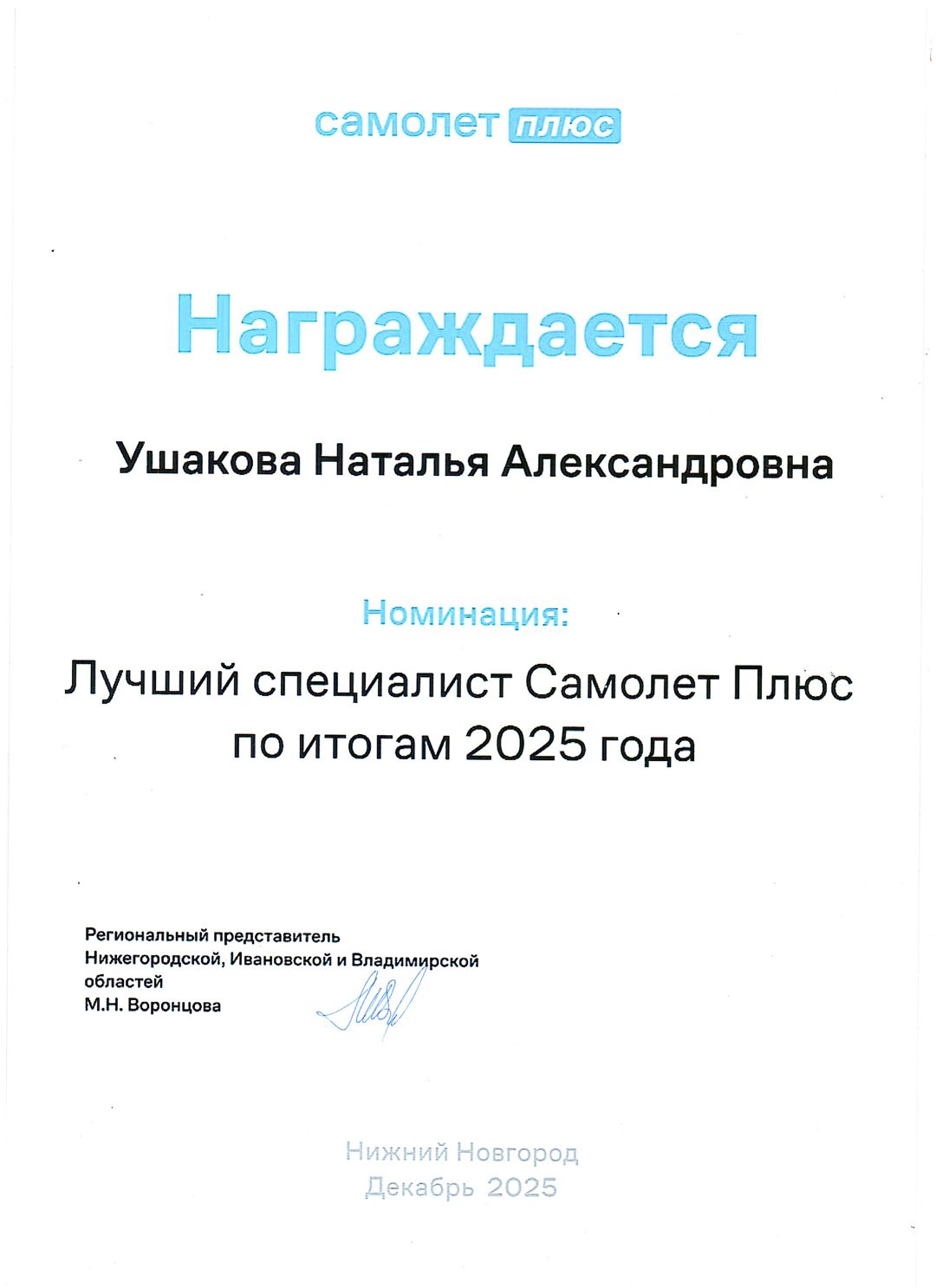 Обращаемся к Наталье уже не первый раз и всегда работа выполнена на все 100% Все организованно,всегда на связи ,на все вопросы четкие ответы. Выражаем огромную благодарность за выполненную работу! Рекомендуем от всего сердца самолет плюс и риелтора Наталью!