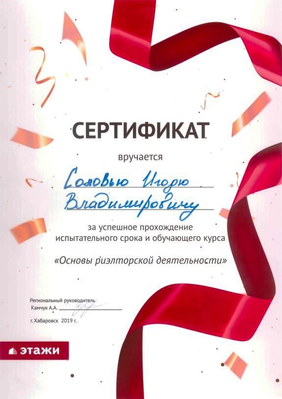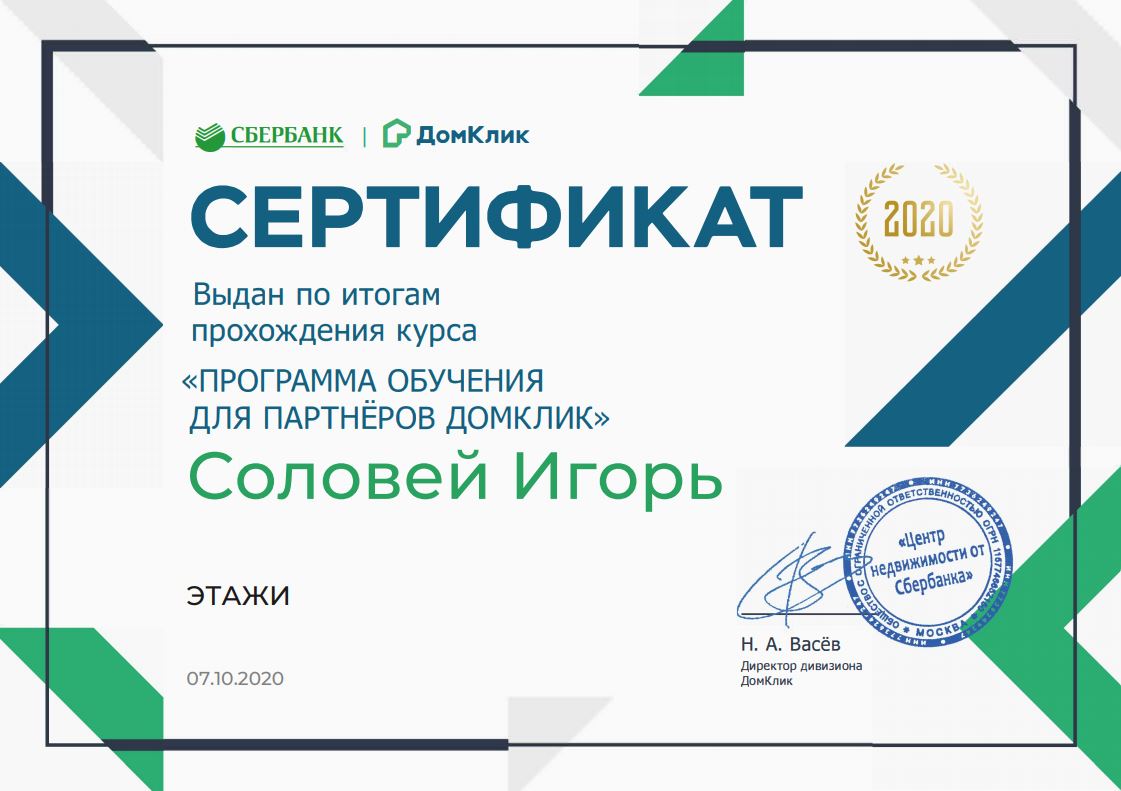 Эксперт по жилой недвижимости Уровень квалификации подтверждён: - Сертификат о прохождении испытательного срока и курса специалиста по недвижимости Этажи - Грамоты 1. Лучший по сделкам, Этажи, июнь 2019 2. Лучший по отзывам клиентов и ипотеке, Этажи, июль 2019 3. Лучший по всем показателям, Этажи, сентябрь 2019 4. Лучший по ипотеке и сделкам, Этажи, январь 2020 5. Лучший агент Сбербанка...
