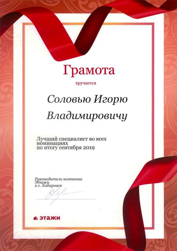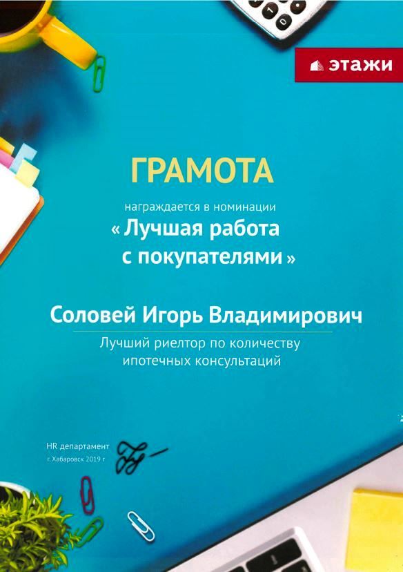 Обращались с супругой к Игорю за покупкой собственного жилья в новостройке. Столь грамотного и профессионального специалиста никогда не видели. Полная консультация по квартирам, предоставление всей информации, что нас интересовала, помощь в подборе и оформлении выгодной ипотеки. Игорь участвовал в каждом из пунктов и консультировал нас в местах, где было трудно понять для людей без опыта. Спасибо...