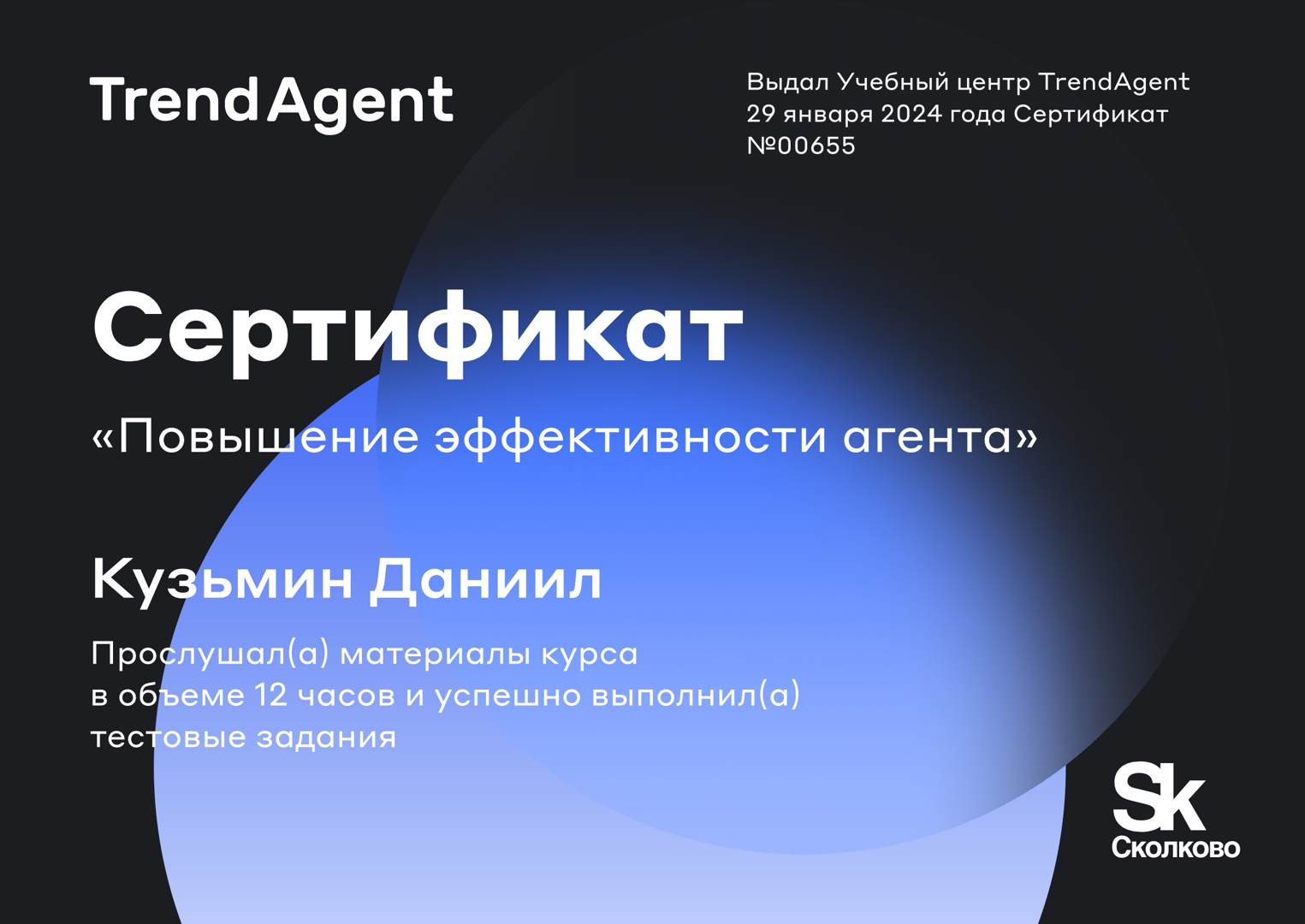 Большая благодарность Даниилу за состоявшуюся сделку! Не смотря на то,что риелтор работал со стороны продавца-он всегда был на связи со мной(покупателем) и консультировал по любым вопросам, помогал в составлении документов, делился опытом. Отличный специалист и добрый, отзывчивый человек, с которым приятно иметь дело!