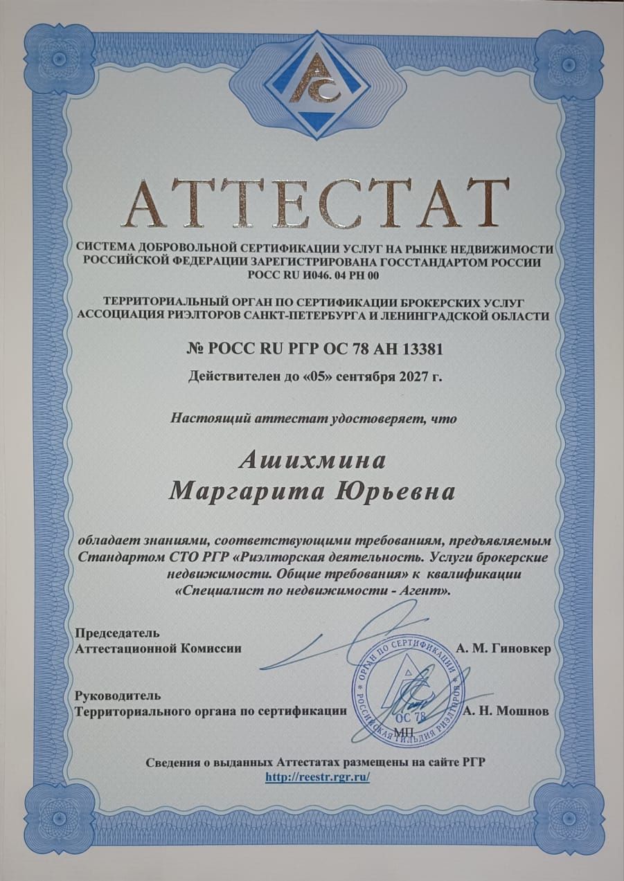 Здравствуйте. Меня зовут Ашихмина Маргарита Юрьевна. Я опытный, квалифицированный специалист, действующий член Ассоциации риэлторов г. С-Пб и ЛО. Работаю в агентстве недвижимости полного цикла.