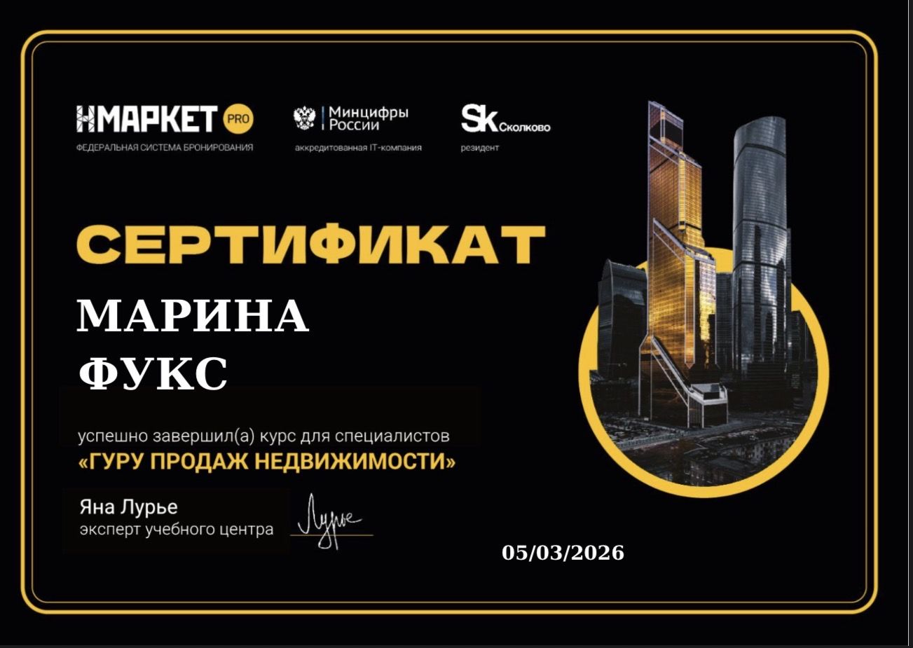 Сделка прошла отлично,весь пакет документов был собран с помощью Марины ,во всех вопросах помогла,всегда была на Связи, Огромное спасибо, и Рекомендую агентство недвижимости Фукс и Партнеры.