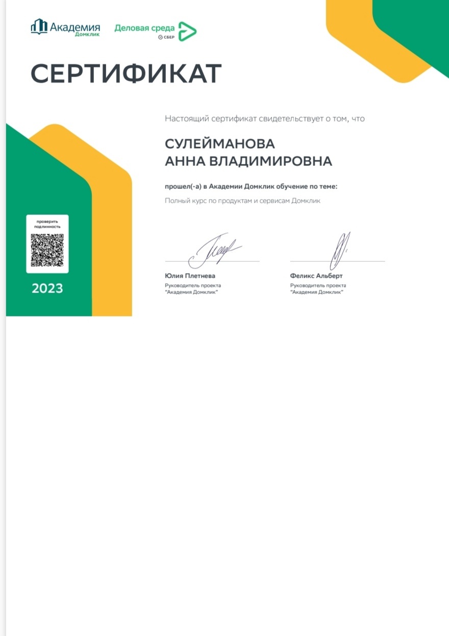 Благодарим риэлтора Анну Сулейманову за отличную работу! Всегда приятно иметь дело с грамотными профессионалами в своем деле. Успешная сделка, комфортное сотрудничество и внимательное отношение к клиентам.