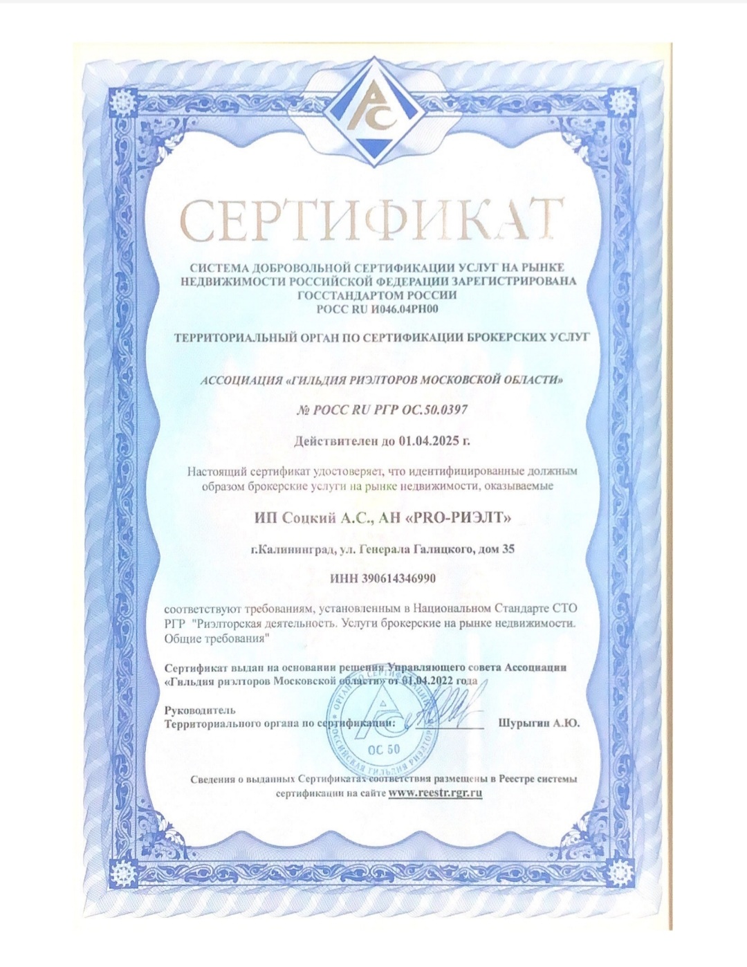 Наша Миссия – оказывать Клиентам брокерские услуги в сфере недвижимости на уровне высших этических и профессиональных стандартов, создавать в Калининграде цивилизованный рынок, где отношения Клиент-Агент-Компания основаны на взаимном доверии и уважении. Надёжность при проведении сделок и безопасность наших клиентов являются безусловным императивом для нас. Это обеспечивается за счёт высокого...