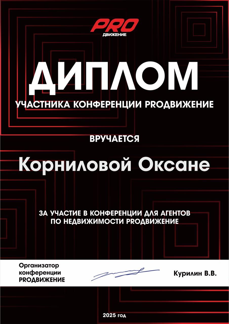 Хочу выразить огромную благодарность нашему риелтору Оксане Корниловой за профессионализм, внимательность и отзывчивость! Процесс покупки и продажи квартиры оказался намного проще благодаря вашему опыту и знанию рынка недвижимости. Вы быстро подобрали подходящие варианты, учли все наши пожелания и помогли сэкономить много времени и сил. За это время пока мы продавали свою квартиру и искали новый...