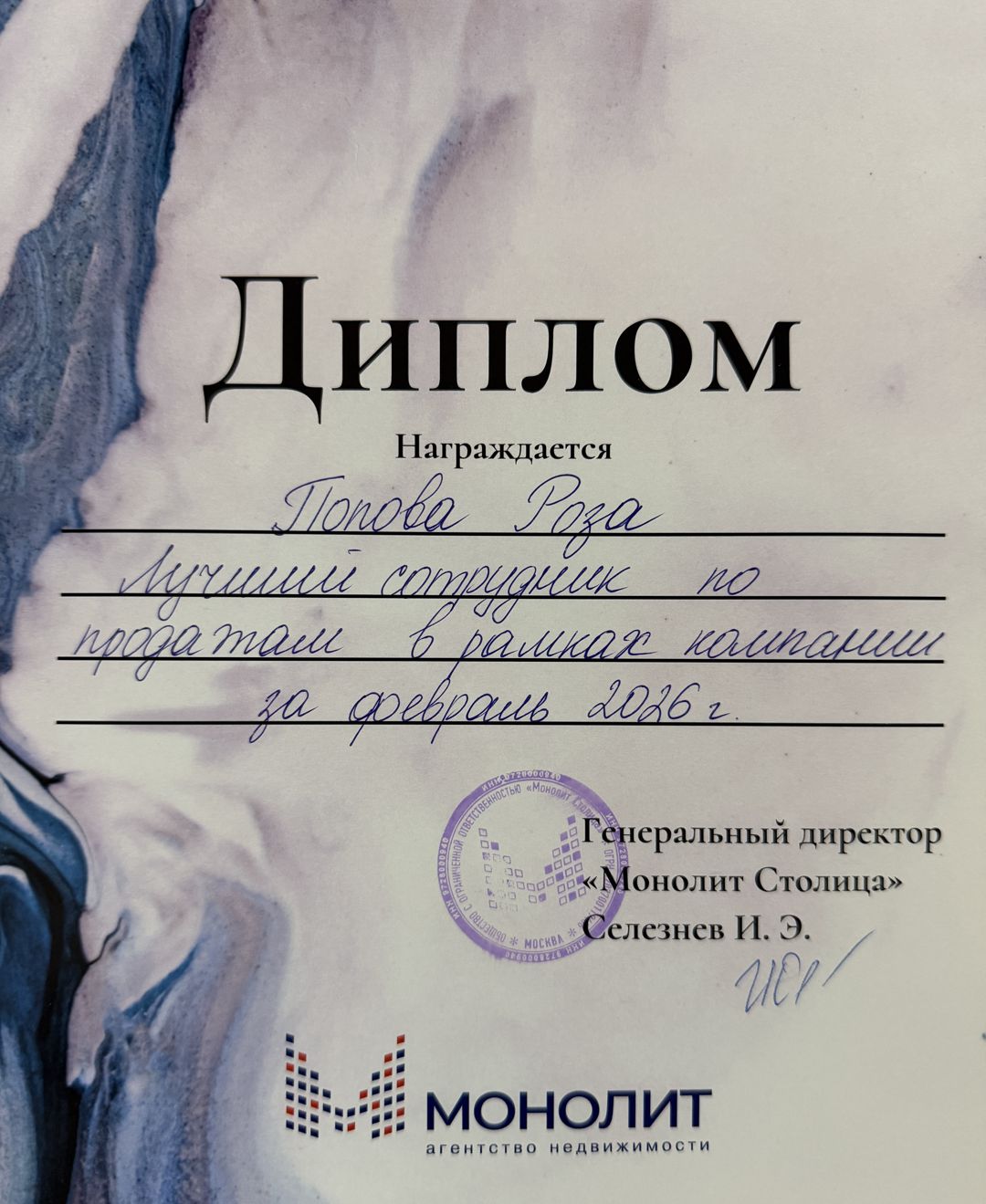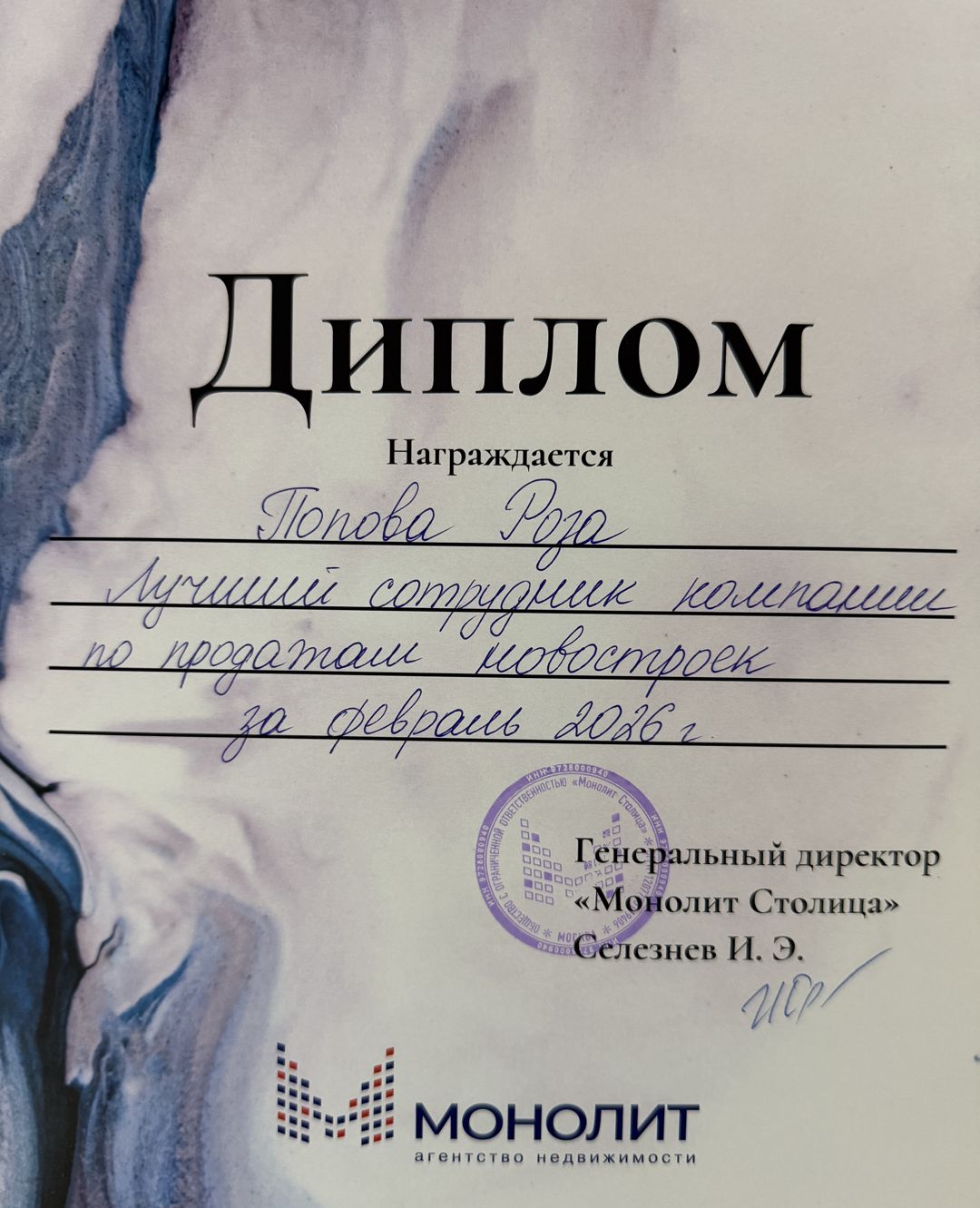 Обращение к Розе Поповой оказалось приятным и продуктивным. Она внимательно изучила наши требования и предложила оптимальные варианты квартир. Подбор жилья прошел легко и быстро благодаря ее опыту. Посещения объектов были организованы удобно, все вопросы решались оперативно. Особо отметим четкость коммуникаций и открытость риелтора. Сделка завершилась успешно, квартира приобретена по оптимальной...