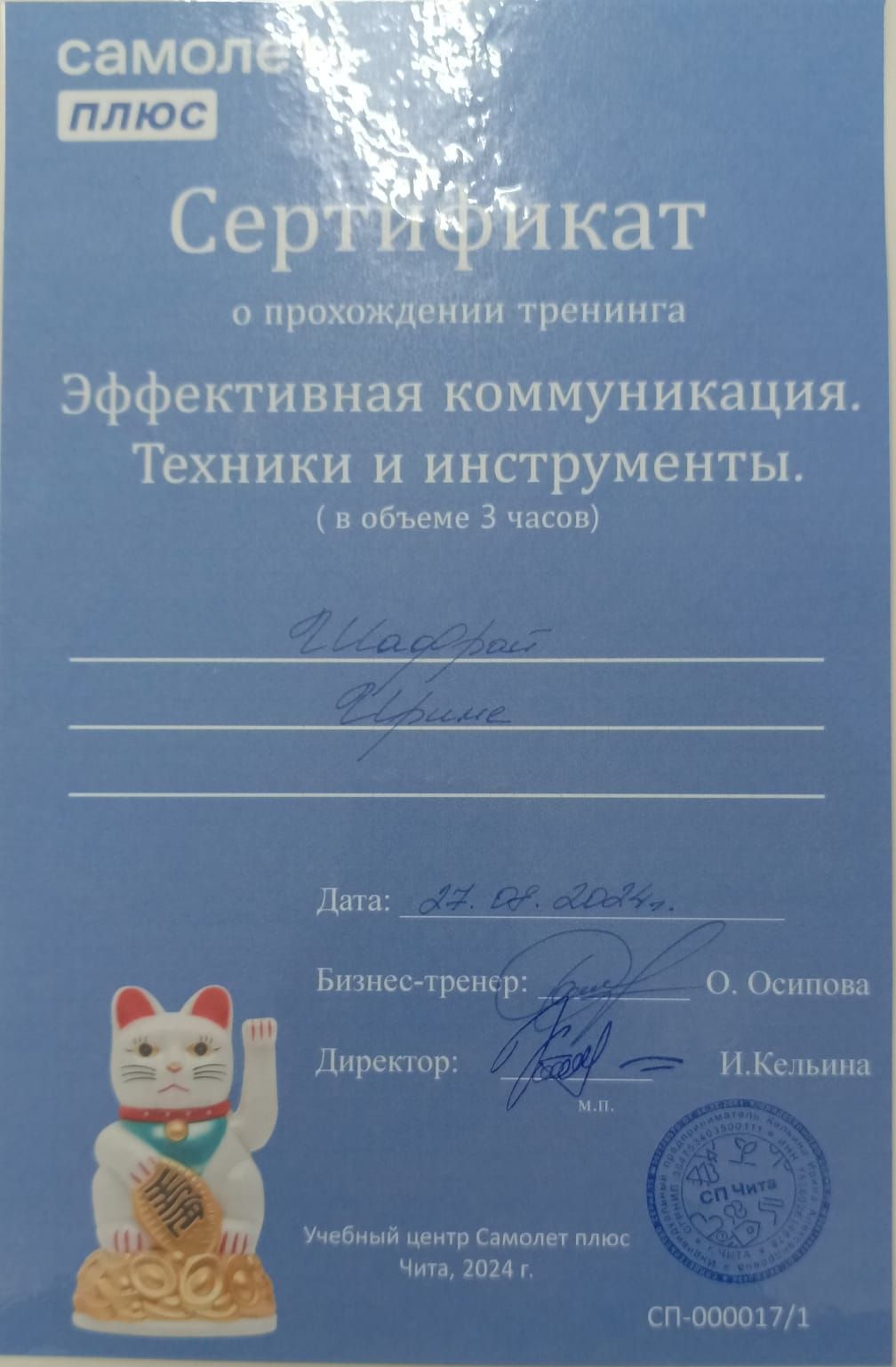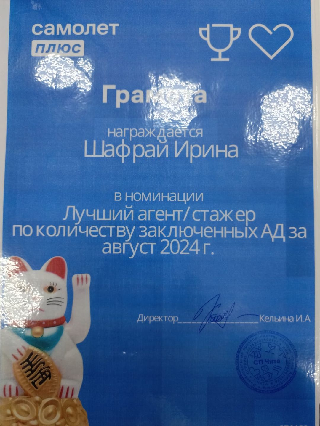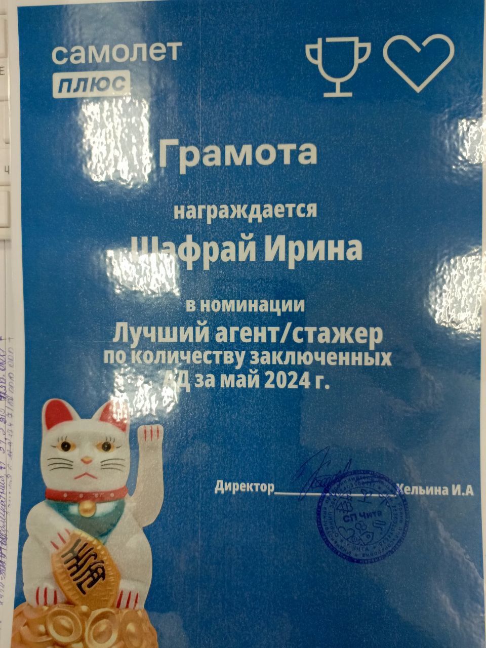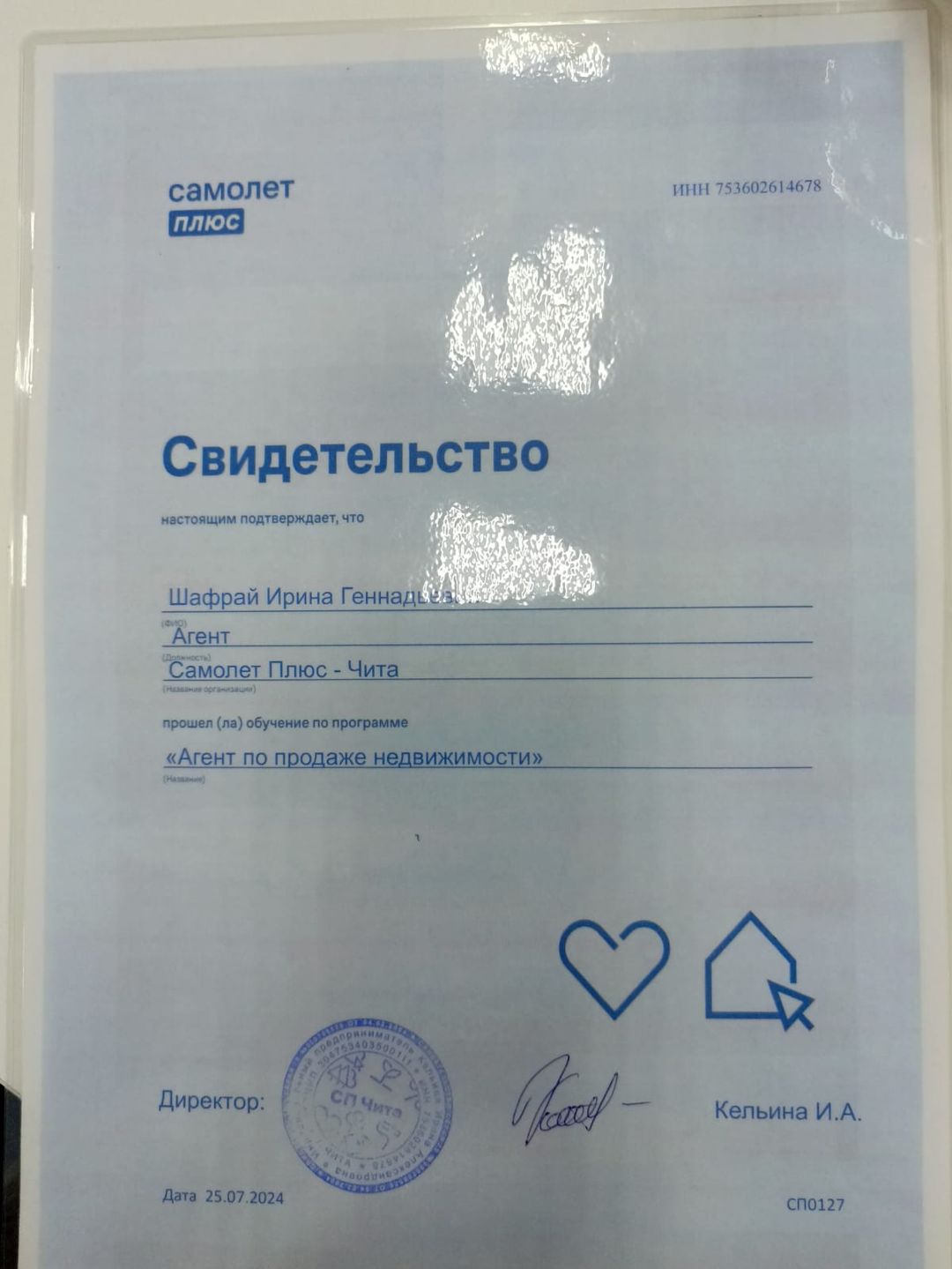 Хочу поблагодарить за личную работу агента Самолют Плюс (Чита) Шафрай Ирину.Быстро и грамотно помогла решить вопрос с продажей дома.Профессионал своего дела.Спасибо за проделанную работу