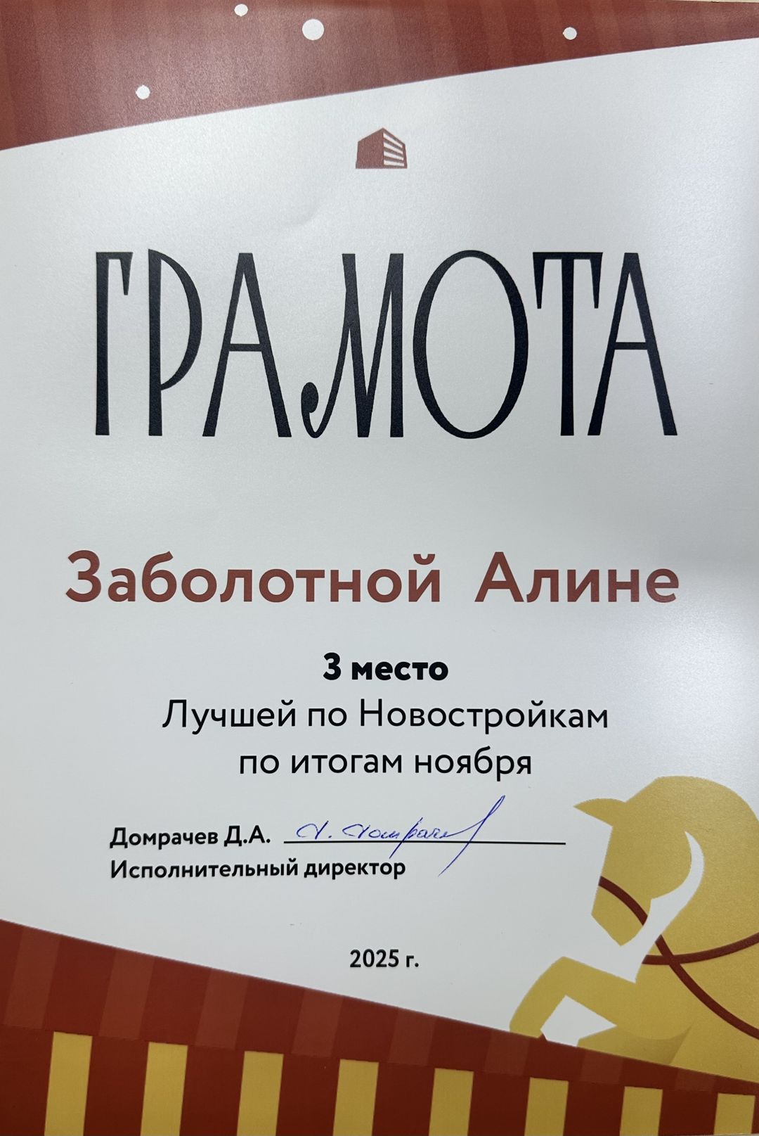 Спасибо большое Алине за профессиональную работу и индивидуальный подход. Всегда была на связи, консультировала по любому поводу, учла все пожелания, помогла со всем пакетом документов. Было очень приятно работать вместе, в итоге купили квартиру мечты в кратчайшие сроки. Однозначно буду рекомендовать и снова обращусь, конечно же, к Алине! Успехов в работе и хороших сделок!👍