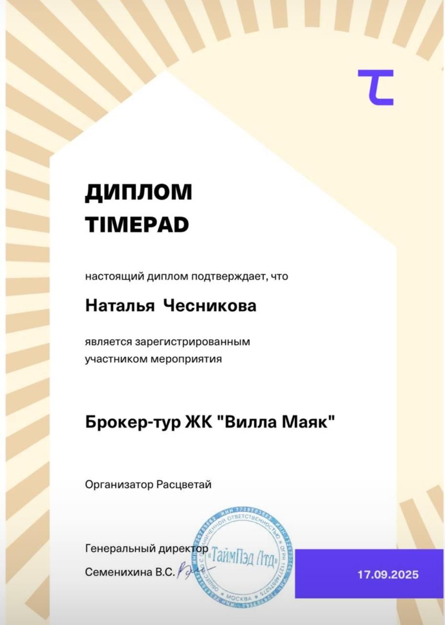 - ВКВиктория К.25 августа 2025, сделка была 30 июля 2025Очень благодарны Наталье,проводили сделку и все прошло успешно! Все проходило быстро,понятно,а если были вопросы,Наталья всегда была с нами на связи,подсказывала и помогала! Даже готова была присмотреть за моими детками!) Спасибо огромное Наталье)