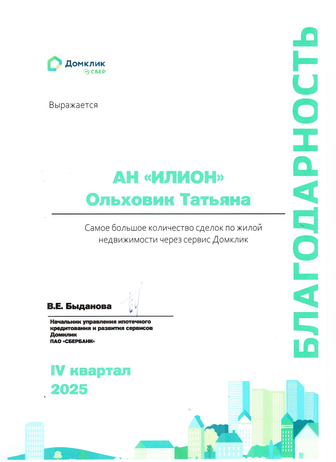 Хочу поблагодарить за помощь в выборе квартиры Татьяну Ольховик. Очень отзывчивая, терпеливая и внимательная. Ответит на все вопросы. Спасибо за помощь.
