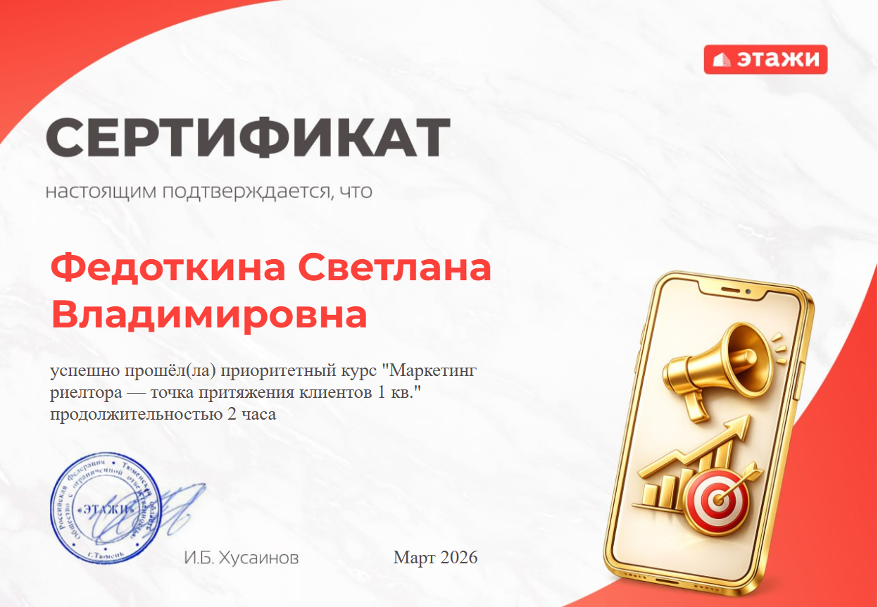 Добрый день! Выражаю искреннюю благодарность за успешное сопровождение сделки по приобретению недвижимости риэлтору Светлане. Ваш профессионализм, внимательность к деталям и умение оперативно решать задачи помогли завершить процесс в кратчайшие сроки. Благодарю за проделанную работу, за терпение, доброту и отзывчивость.