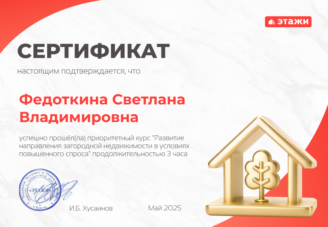 Большое спасибо за помощь по поиску и приобретению квартиры. Сделка прошла онлайн на Домклик в офисе компании Этажи. Все прошло спокойно, быстро и безопасно. Благодарю Светлану за профессионализм, ответственность и внимательность, человеческий подход. Я остался доволен работой с ней. Рекомендую всем обращаться к Светлане!