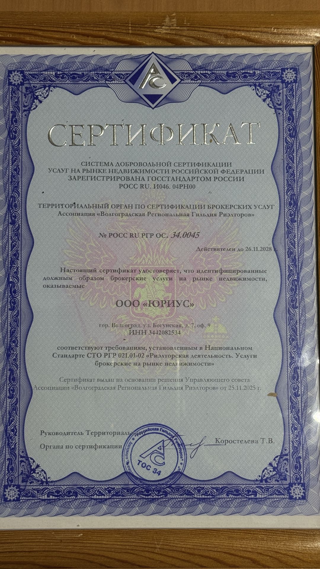 Агентство ЮРИУС работает на рынке недвижимости 20 лет, и все это время я - бессменный директор и основатель этого агентства. Агентство является действительным членом Ассоциации Волгоградская Гильдия Риэлторов, входящей во Всероссийскую Гильдию Риэлторов. В наше агентстве работают только профессиональные риэлторы, имеющие специализированную подготовку. Организация аттестована, и аккредитована....