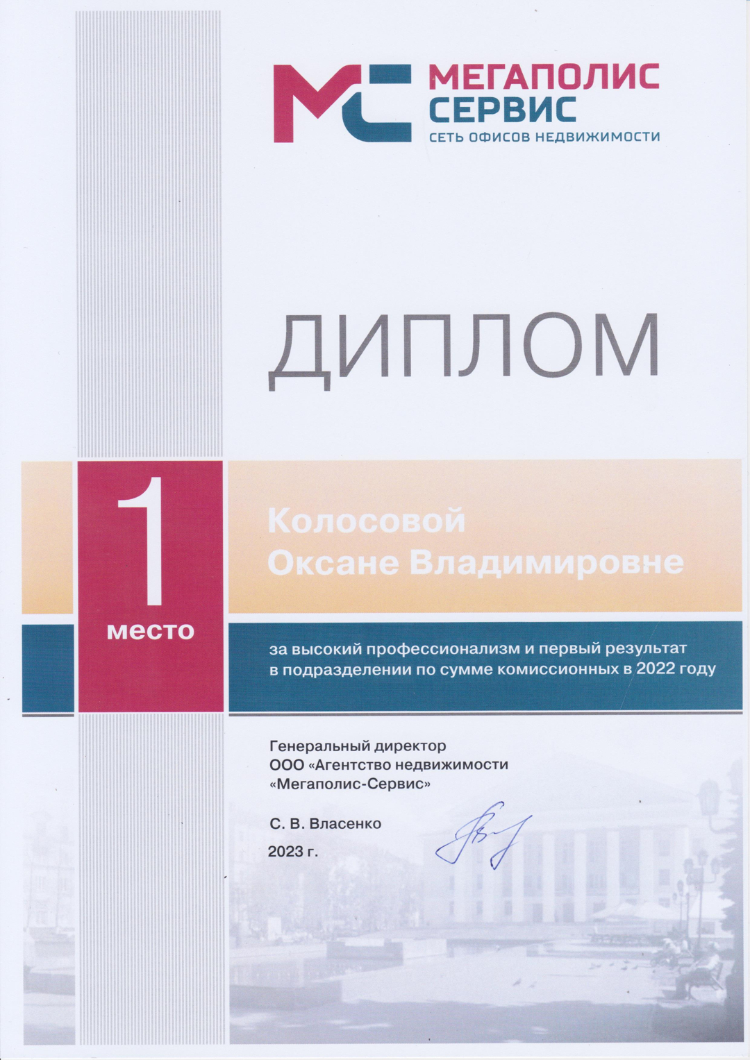 Покупали квартиру через Колосову Оксану. Работой данного риэлтора очень довольны. Коммуникабельная, юридически грамотная, пунктуальная. Всегда была на связи. Показала себя как грамотный специалист своего дела! Будем рекомендовать!