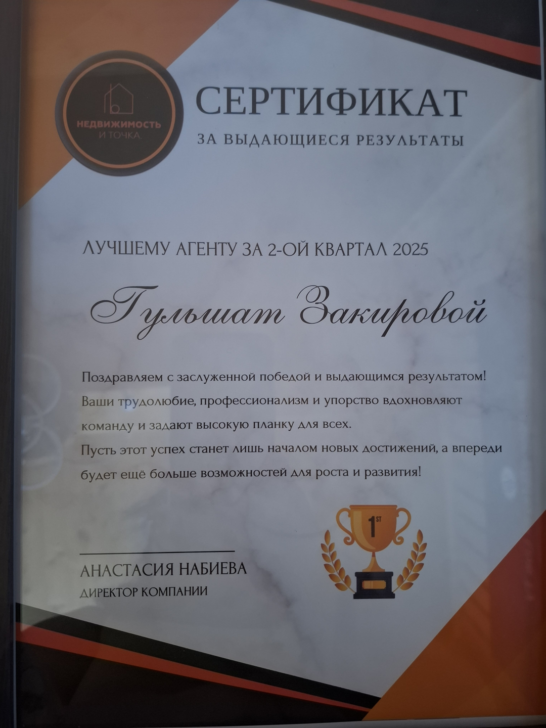 Хочу выразить огромную благодарность, Гульшат Ульфатовне, за быструю и профессиональную работу по продаже моей квартиры! Сделка прошла без лишних хлопот, все этапы были четко организованы. Гульшат всегда была на связи, отвечала на все вопросы и давала ценные советы. В результате квартира была продана намного быстрее, чем я ожидала. Рекомендую всем, кто ищет надежного специалиста!👍👍👍