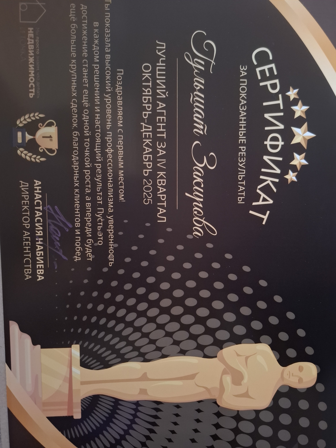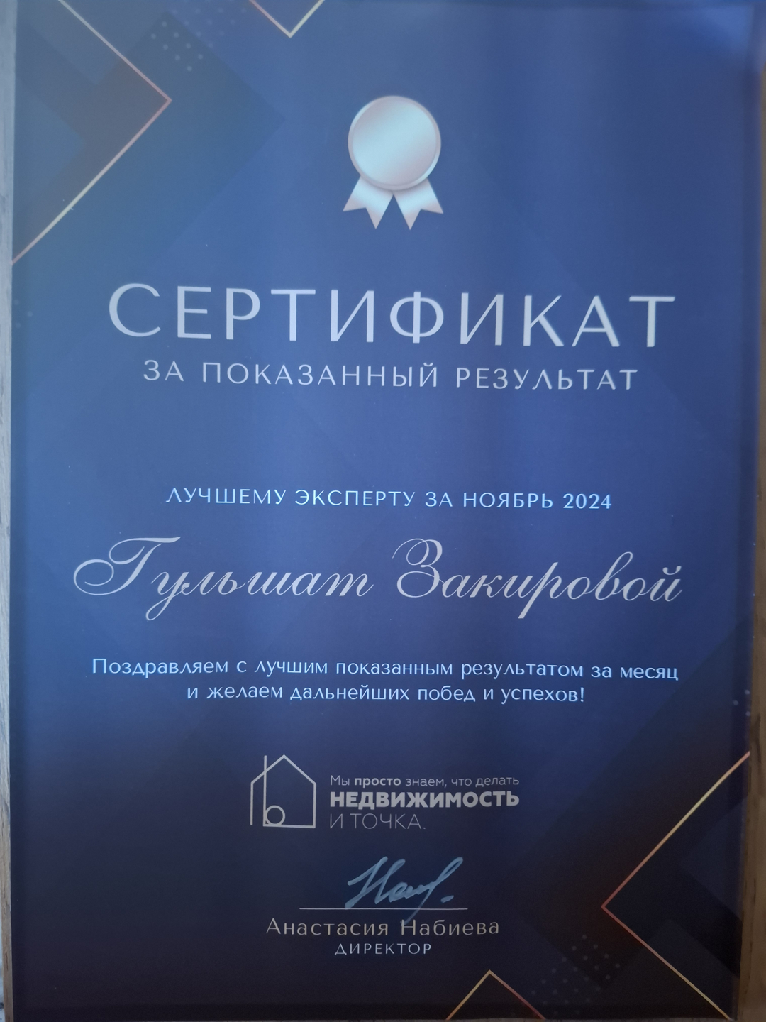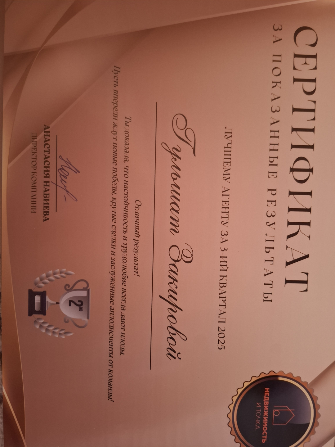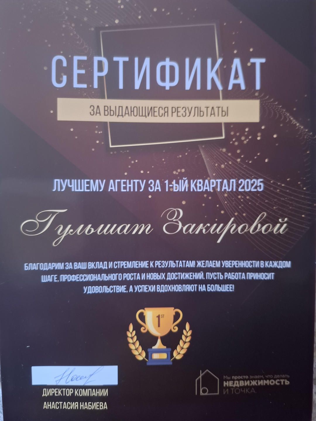 Хочу выразить свою благодарность риэлтору Гульшат Ульфатовне за проделанную работу в оформлении ипотечного кредита и покупки дома. У меня остались самые положительные впечатления. Гульшат Ульфатовна, огромное спасибо за оформление всех документов и грамотно проведенной сделки. Без тебя мы бы не справились. Все было проведено удачно и с хорошим настроением. Ты специалист своего дела🤍С тобой легко...