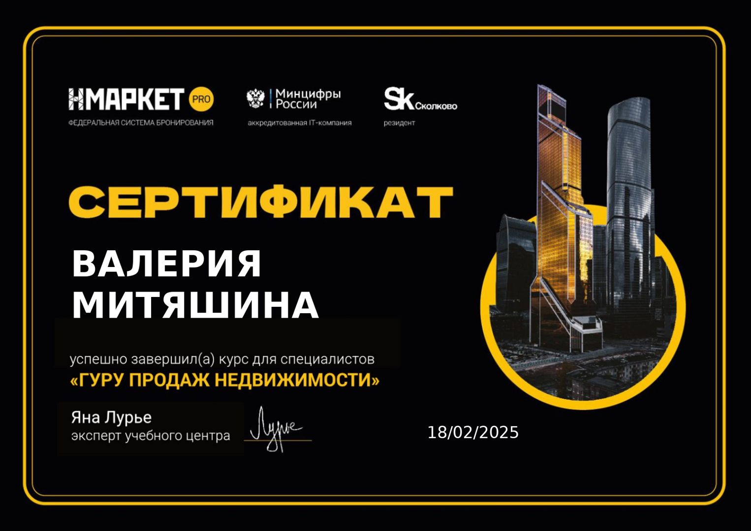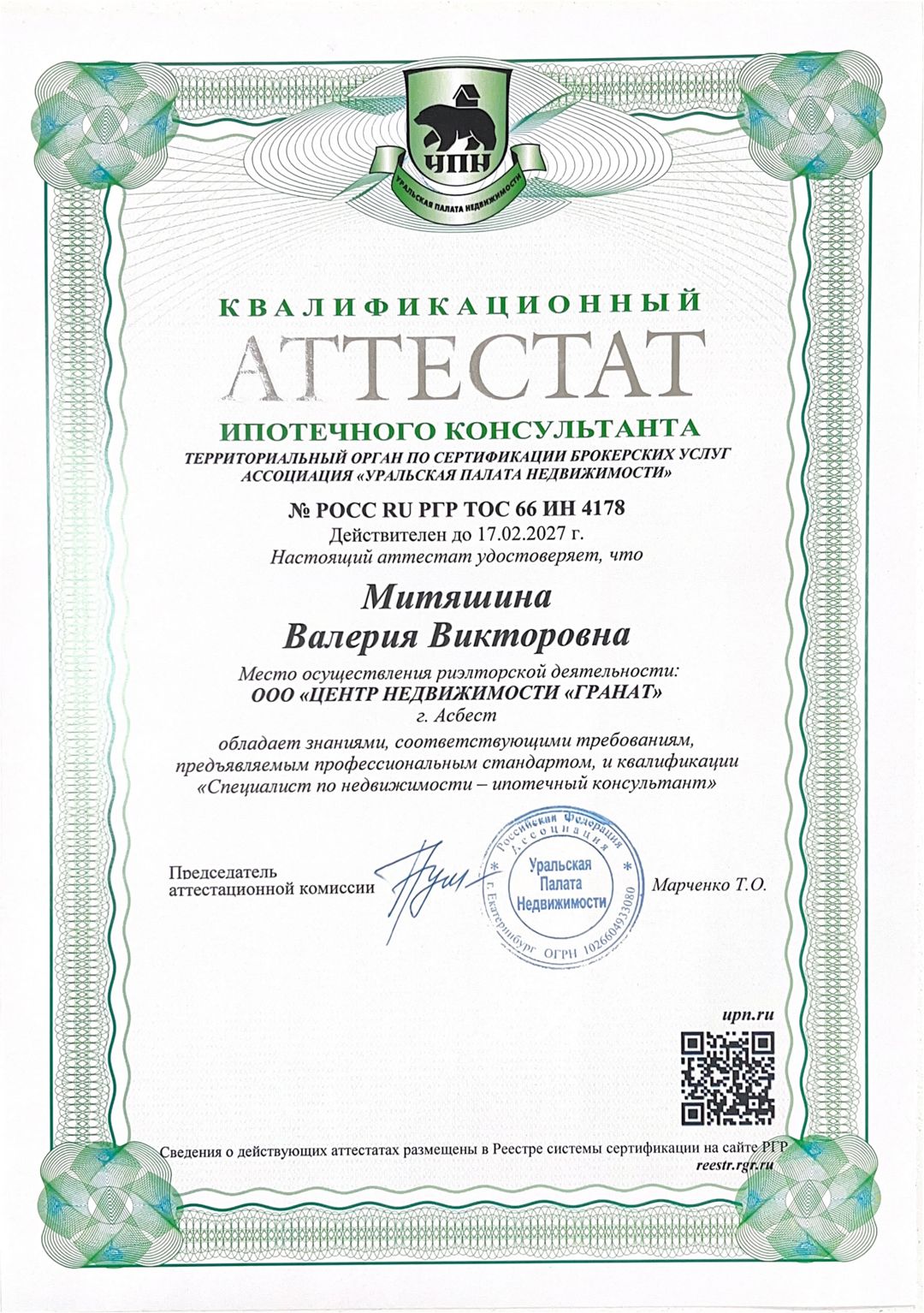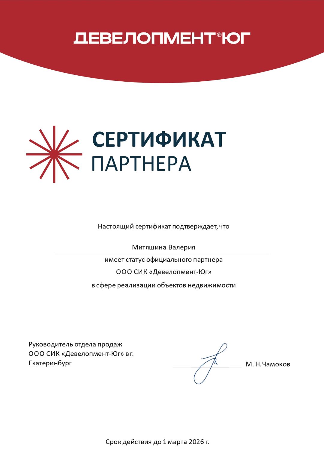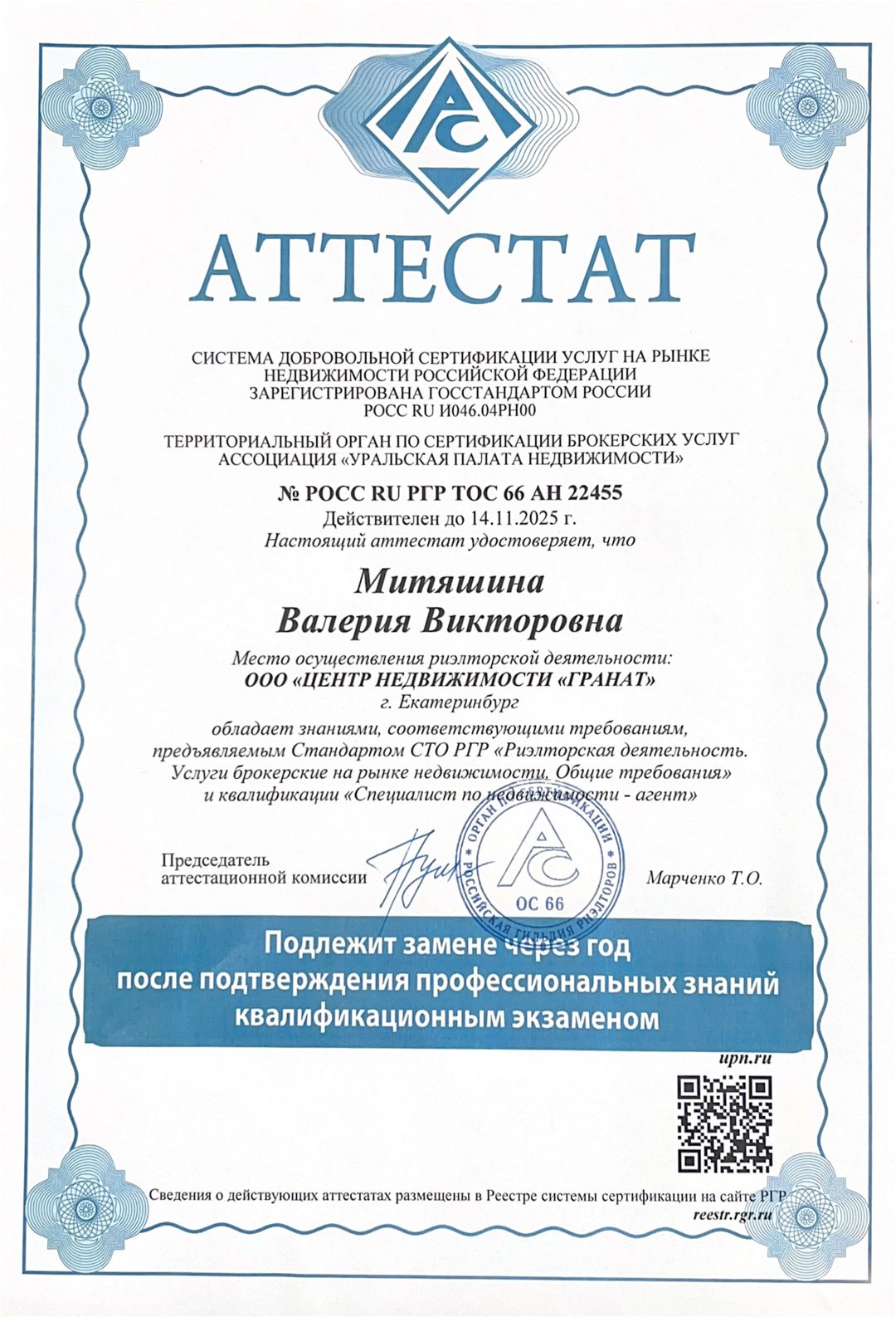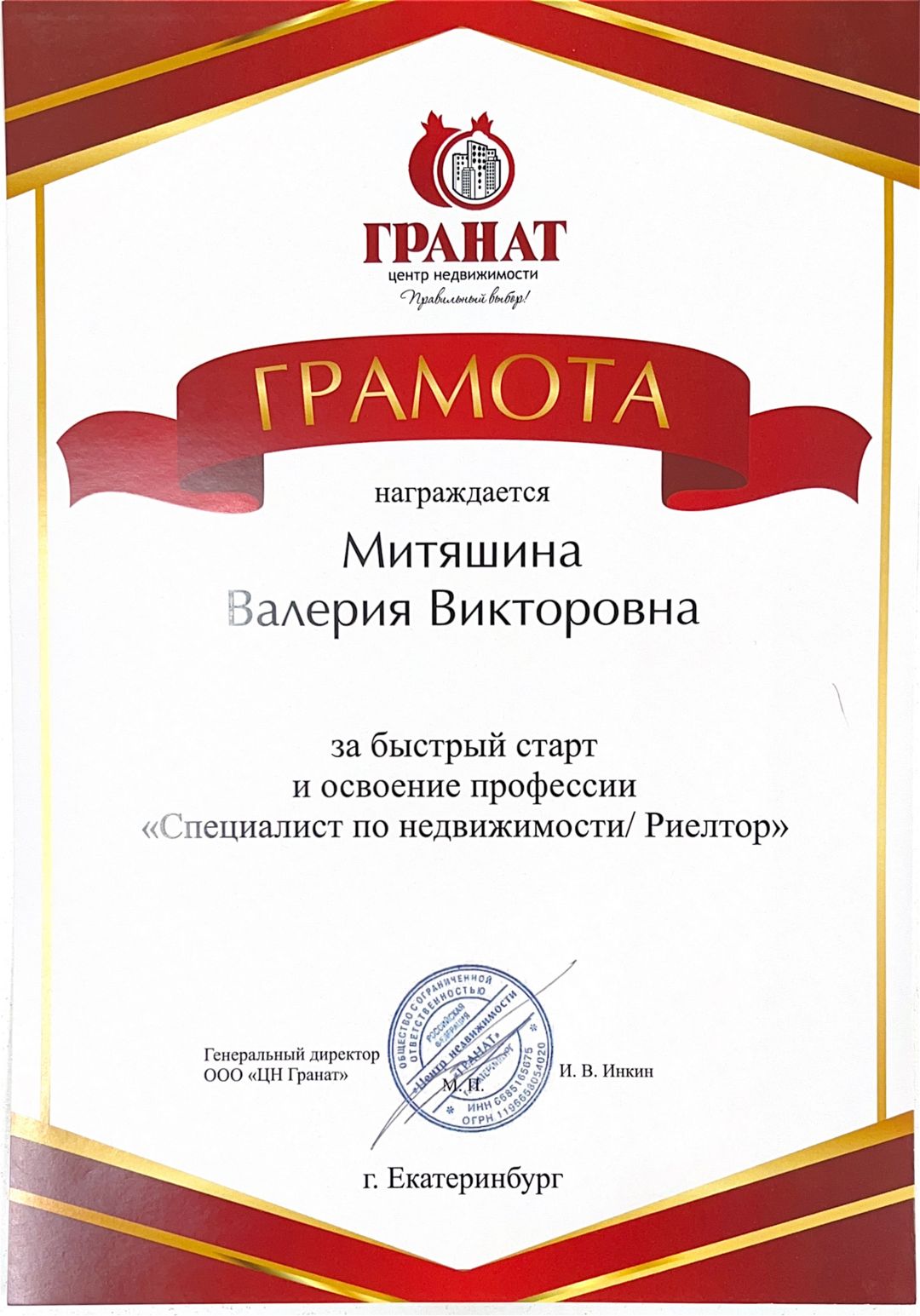 Хотим выразить огромную благодароность Митяшиной Валерии Викторовне из ЦН Гранат. Благодаря её профессионализму, чуткости и ответственности без проблем провели две сложные сделки по купле-продажи квартир (альтернатива) в Екатеринбурге. Валерия сопровождала каждый шаг, всегда была на связи. Если еще понадобятся услуги риэлтора, будем обращаться только в ЦН Гранат к Митяшиной Валерии Викторовне!