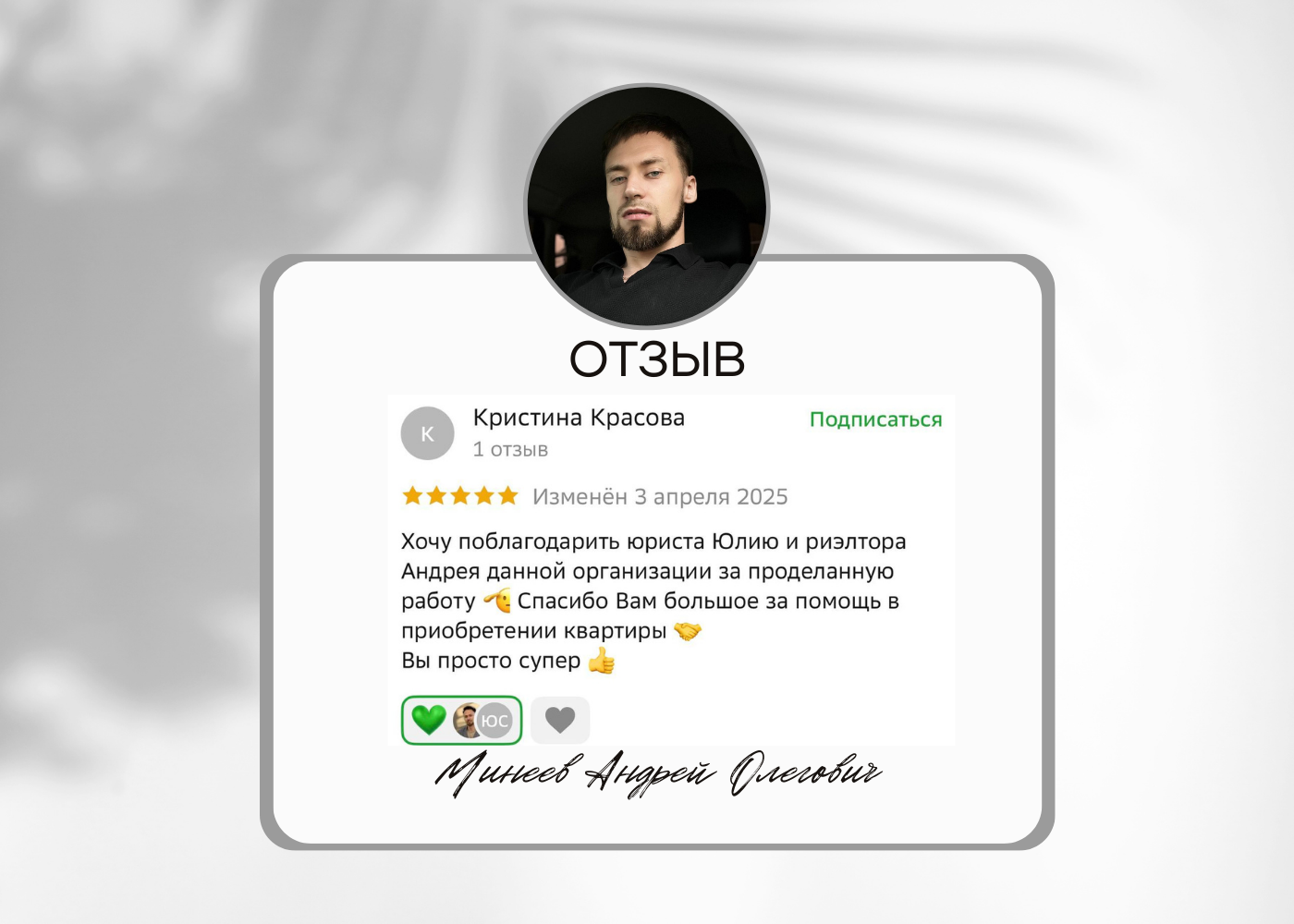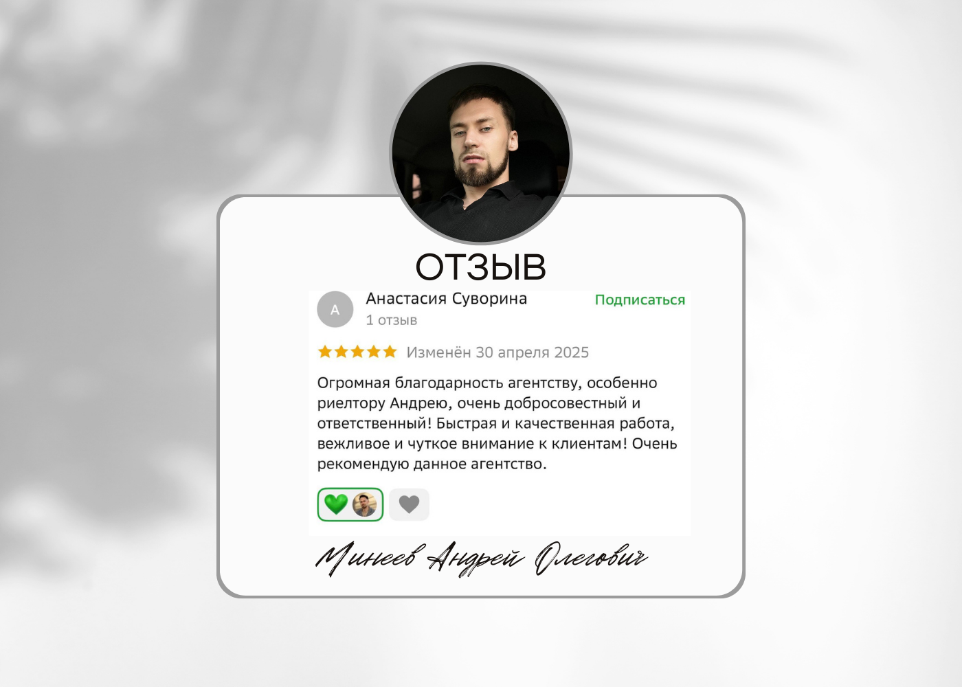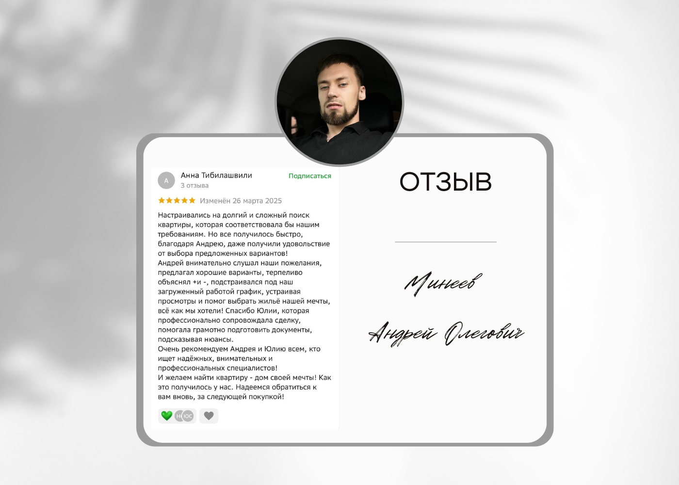 Хочу сказать большое спасибо Минееву Андрею! Помог дистанционно приобрести квартиру в кратчайшие сроки. Спасибо за работу и бесконечную поддержку на протяжении всего периода нашего общения! Все было произведено быстро, качественно, без головной боли. Осталось очень хорошее впечатление! С уверенностью могу рекомендовать Андрея!