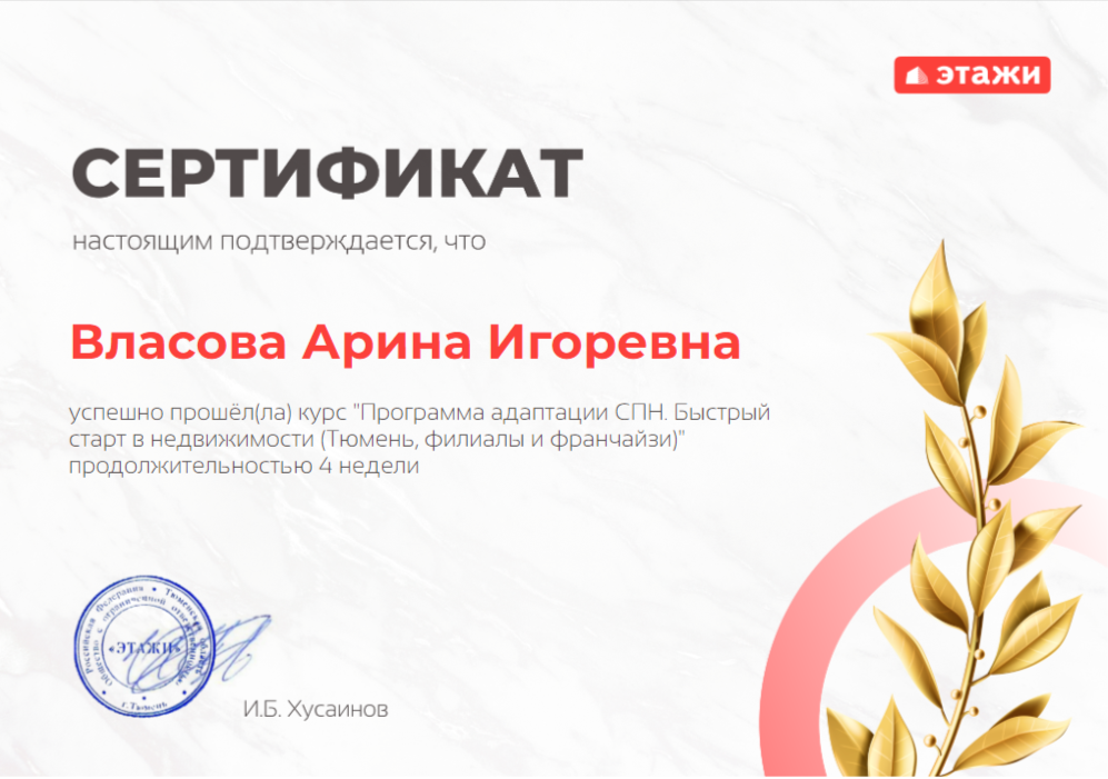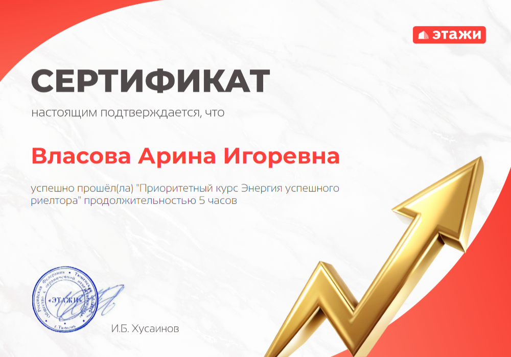 Благодарю риелтора Арину Власову за профессиональную работу! Очень внимательный, профессиональный и вежливый специалист. Сделка производилась удаленно, очень все слаженно, четко и прозрачно. Я чувствовала себя в безопасном пространстве. Желаю Арине процветания и профессиональных успехов!