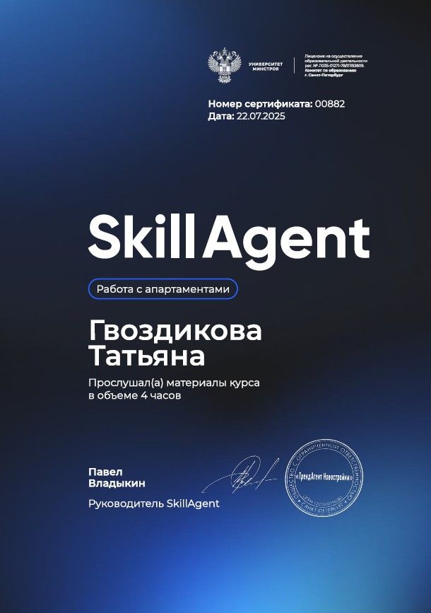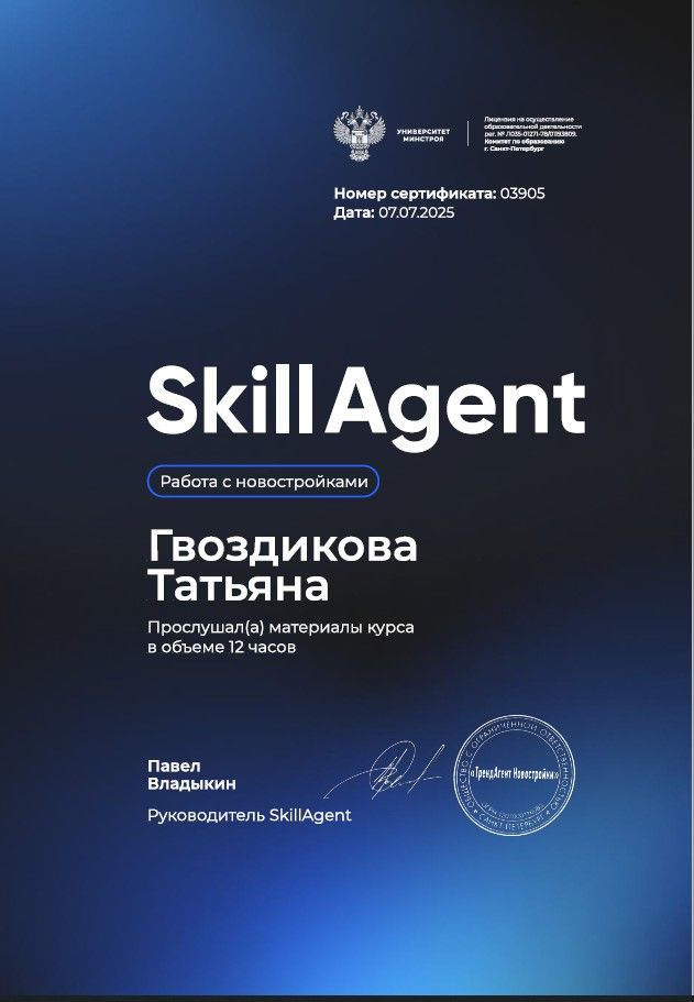 Хочу выразить свою благодарность риэлтору Гвоздиковой Татьяне, за профессионализм и помощь в продаже дома и покупки квартиры.Работа была выполнена очень качественно, все договоренности соблюдены.Большое Вам спасибо! Обязательно буду Вас рекомендовать!