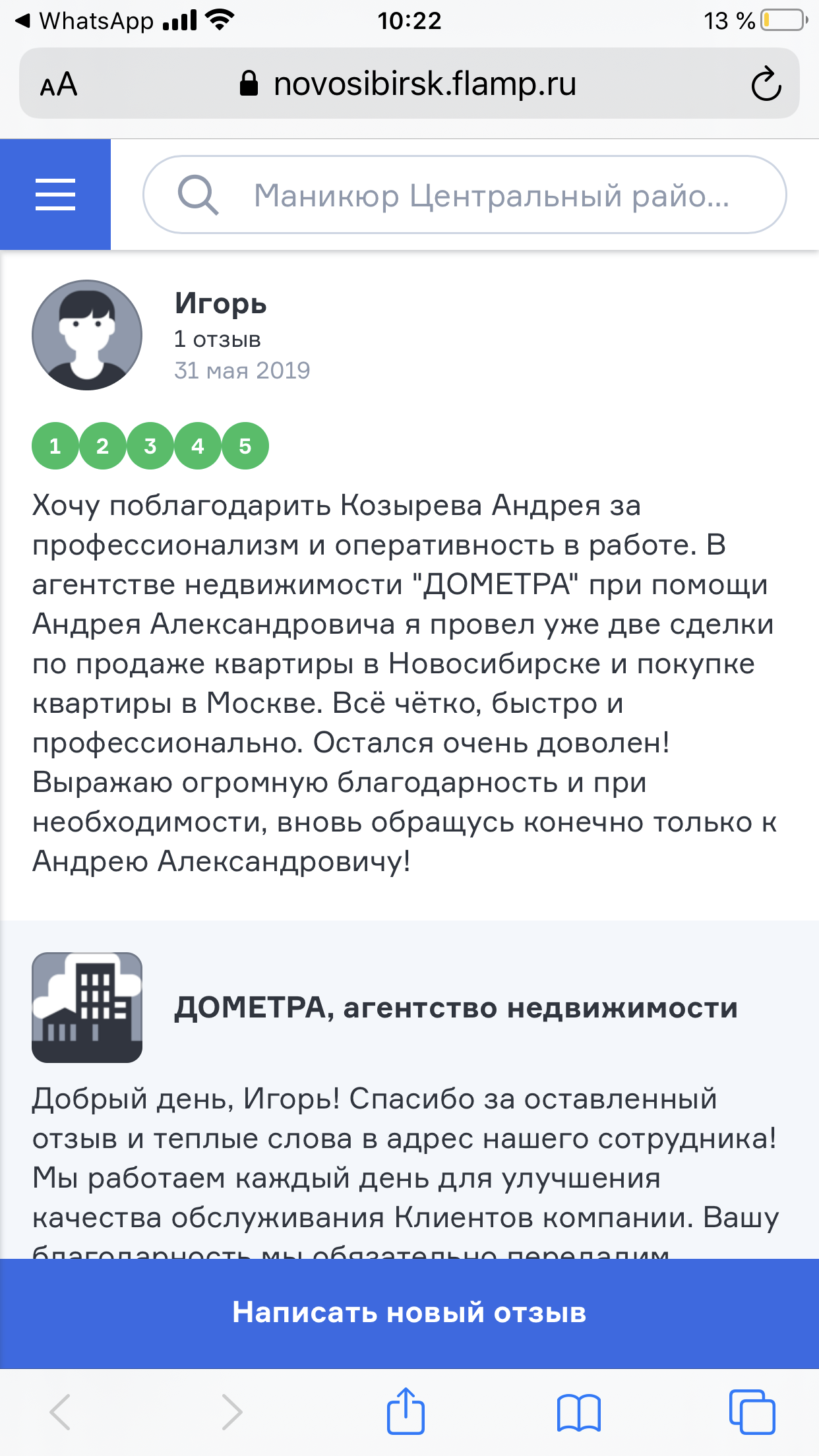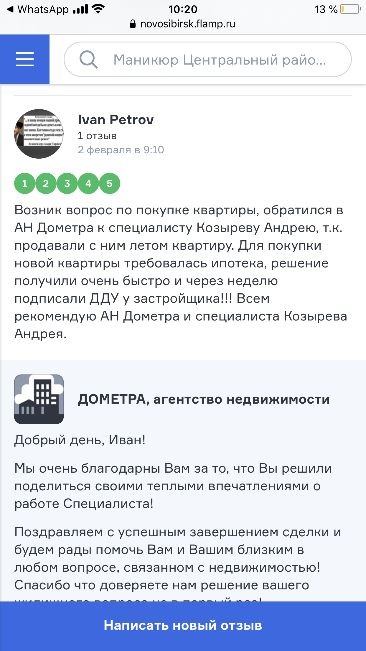 Если вам нужно найти агента по недвижимости в Новосибирске для продажи или покупки квартиры, воспользуйтесь поиском на Домклик. Ориентируйтесь на опыт работы агента, количество совершённых сделок и отзывы.