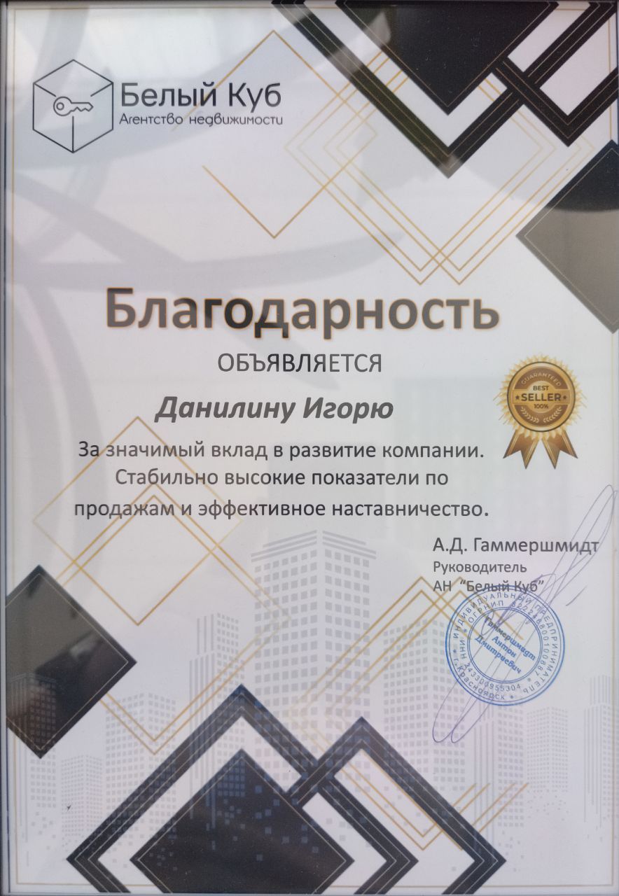 Я хочу выразить огромную благодарность Данилину Игорю! Я искренне благодарна судьбе за то, что она свела меня с этим человеком. Изначально я решила продать квартиру самостоятельно, без помощи риелторов. Но всё оказалось не так просто: мне звонили только риелторы, а потенциальных покупателей не было совсем. Ситуация изменилась, когда коллеги моей дочери посоветовали обратиться к Данилину Игорю....