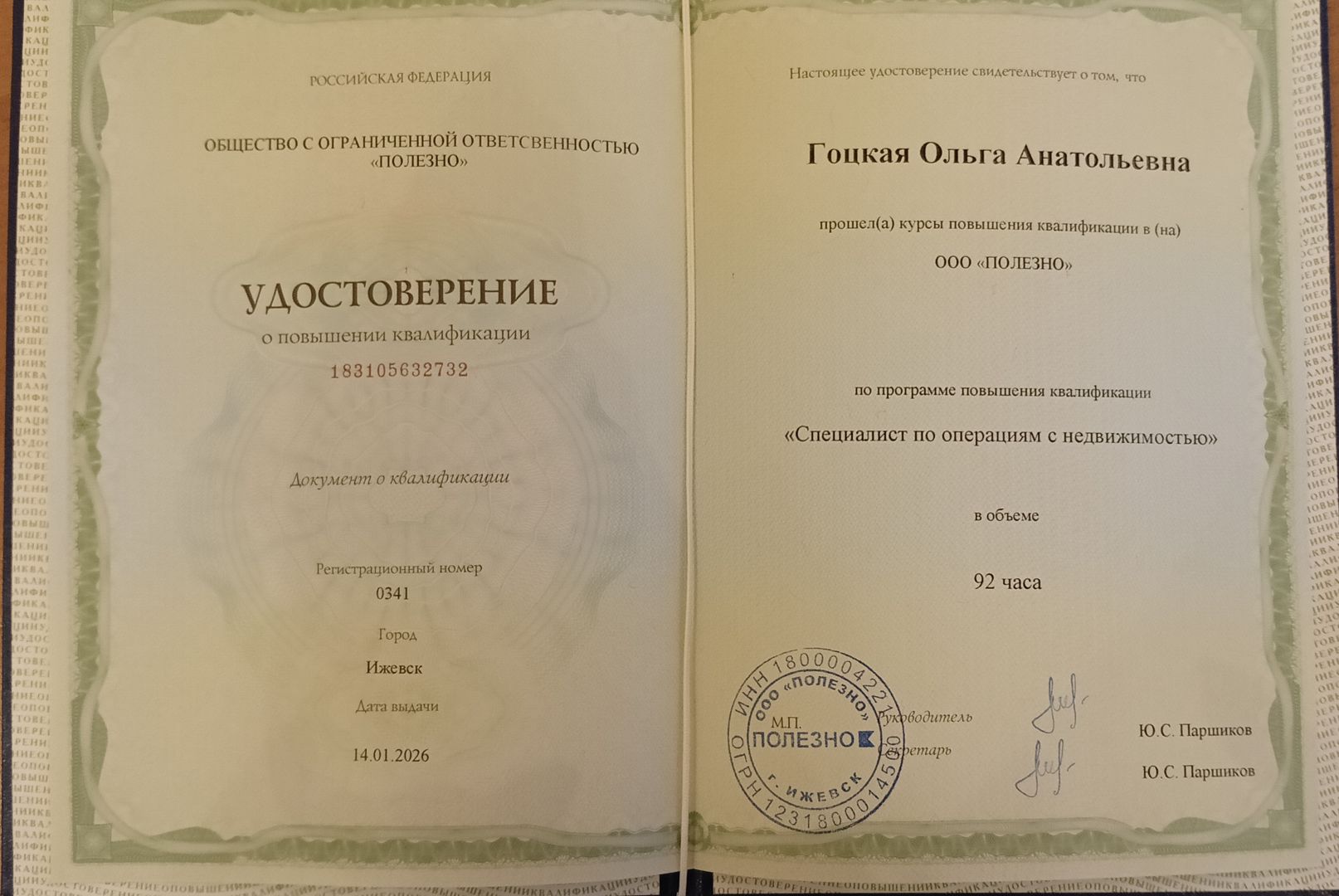 Обратилась за помощью в приобретении жилого дома. Вопрос с Ольгой решили быстро, подобрали дом по моим запросам и критериям. С оформлением справились очень быстро, хотя я думала, что это нерешаемый вопрос. Сделку провели корректно. Остались самые лучшие впечатления от общения. Спасибо огромное. Буду рекомендовать!
