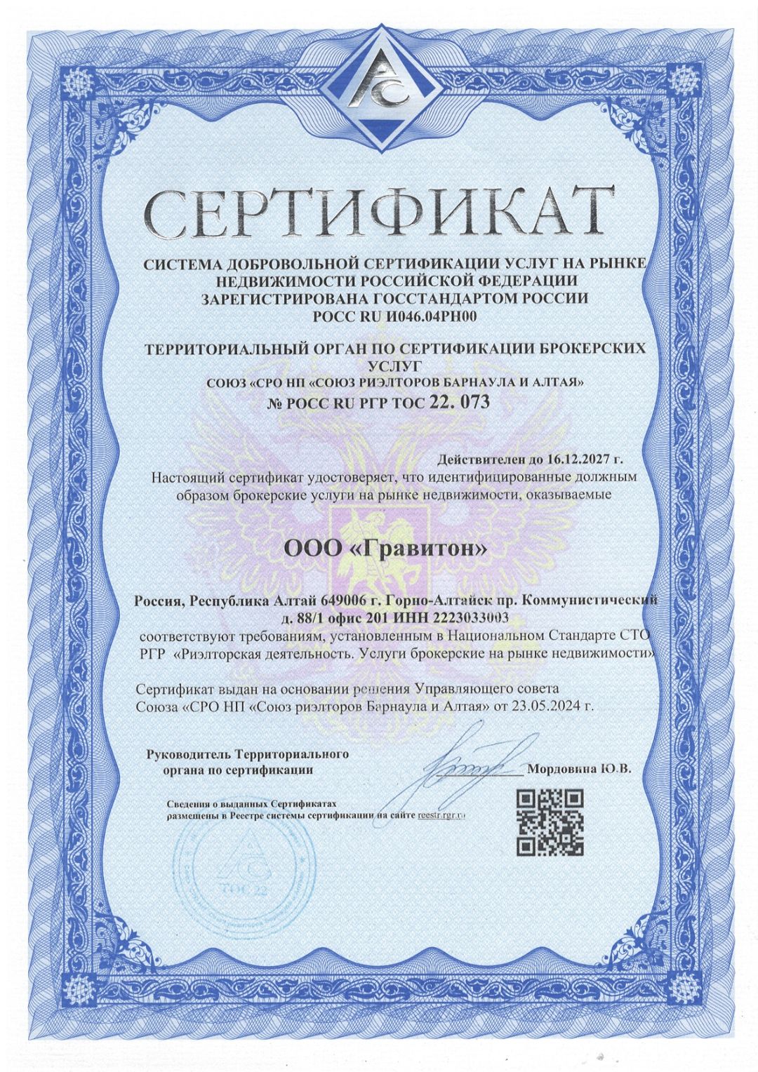 Агентство недвижимости «Гравитон» основано в 2000 году. Профессиональная деятельность сертифицирована и застрахована. Генеральный директор компании Ирина Игоревна Снитко. Компания Гравитон внесена в Единый реестр сертифицированных компаний и аттестованных специалистов рынка недвижимости РФ и является действительным членом Российской Гильдии Риэлторов и Союза Риэлторов Барнаула и Алтая. За...