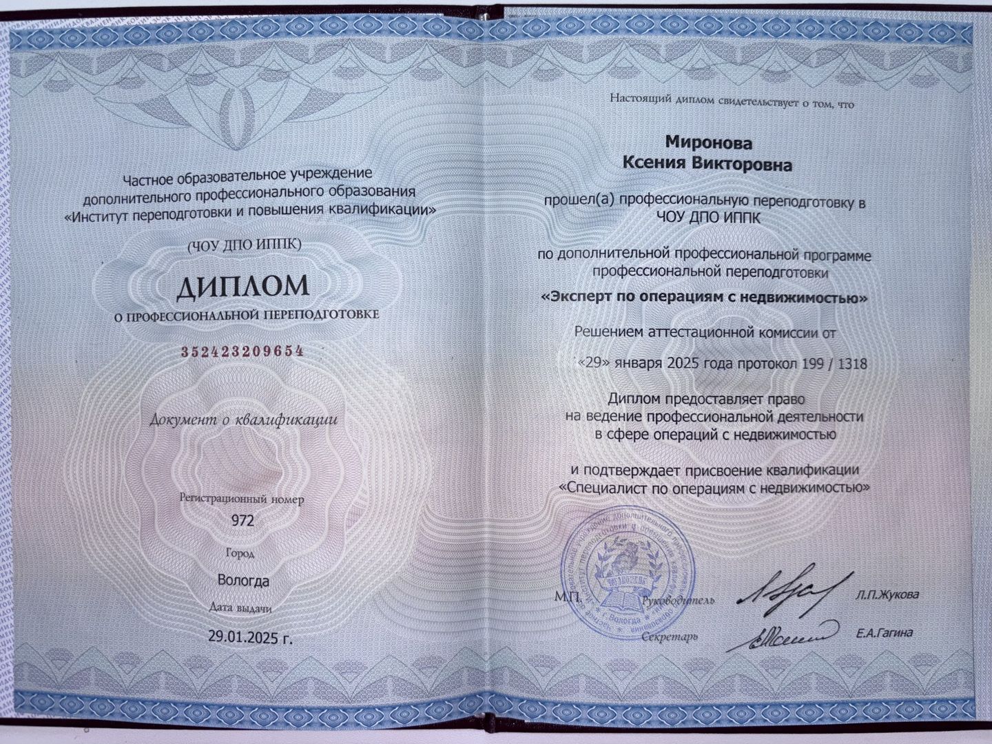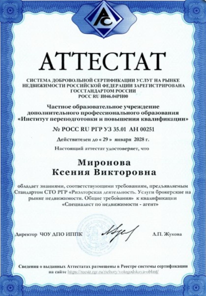 Я дипломированный эксперт по операциям с недвижимостью. Прошла аттестацию по системе добровольной сертификации услуг на рынке недвижимости РФ. Работаю с любыми видами недвижимости.