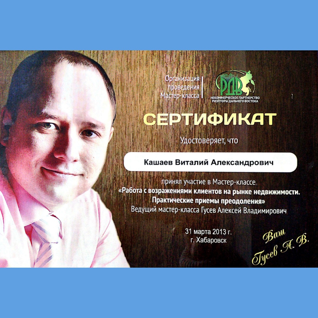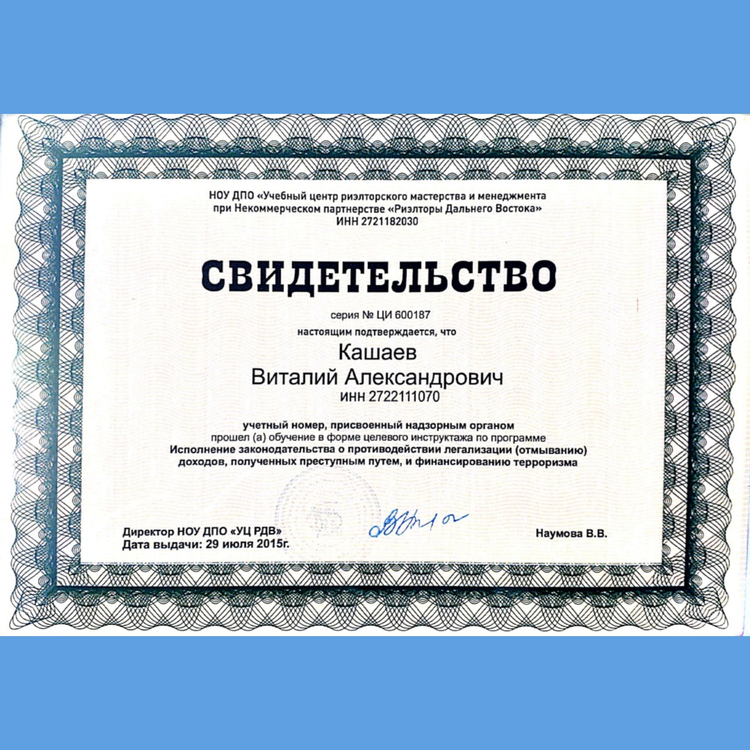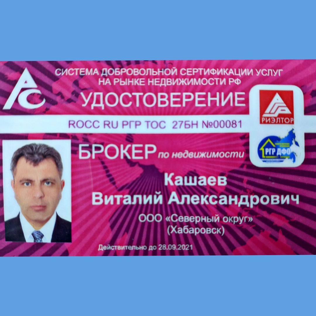 Руководитель отдела недвижимости компании МФЦ + Ассоциация саморегулируемая организация «Региональная гильдия риэлторов Дальневосточного федерального округа» Аттестат: №РОСС RU РГР ТОС 27БН0003 Срок действия: 19.10.2024 Специализация: Вторичная и Коммерческая недвижимость, Управление инвестициями.